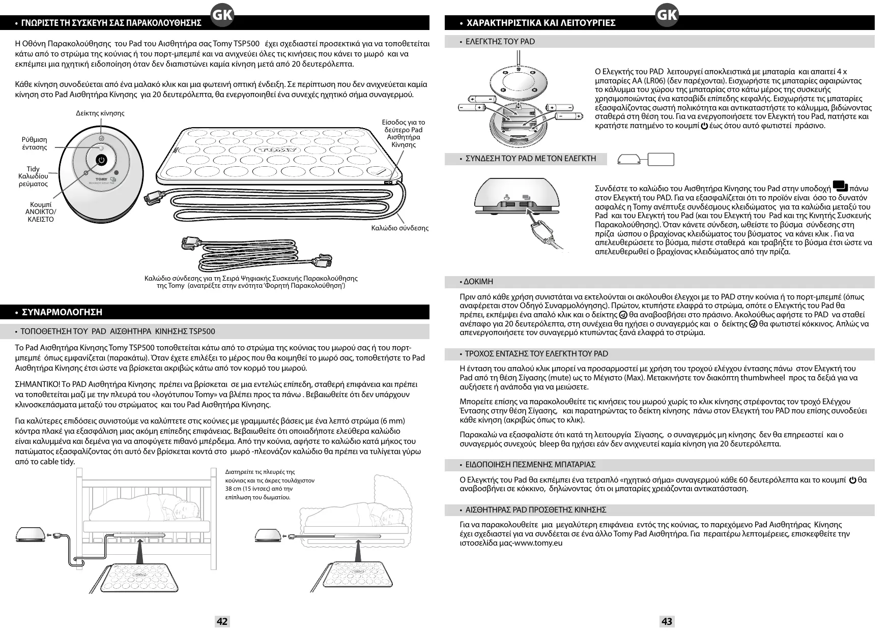- ΑΙΣΘΗΤΗΡΑΣ PAD ΠΡΟΣΘΕΤΗΣ ΚΙΝΗΣΗΣ Για να παρακολουθείτε μια μεγαλύτερη επιφάνεια εντός της κούνιας, το παρεχόμενο Pad Αισθητήρας Κίνησης έχει σχεδιαστεί για να συνδέεται σε ένα άλλο Tomy Pad Αισθητήρα. Για περαιτέρω λεπτομέρειες, επισκεφθείτε την ιστοσελίδα μας-www.tomy.eu