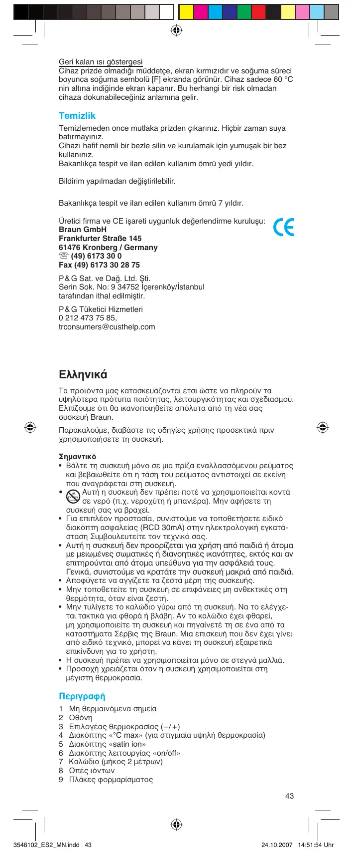- Μην τυλίγετε το καλώδιο γύρω από τη συσκευή. Να το ελέγχεται τακτικά για φθορά ή βλάβη. Αν το καλώδιο έχει φθαρεί, μη χρησιμοποιείτε τη συσκευή και πηγαίνετέ τη σε ένα από τα καταστήματα Σέρβις της Braun. Μια επισκευή που δεν έχει γίνει από ειδικό τεχνικό, μπορεί να κάνει τη συσκευή εξαιρετικά επικίνδυνη για το χρήστη.