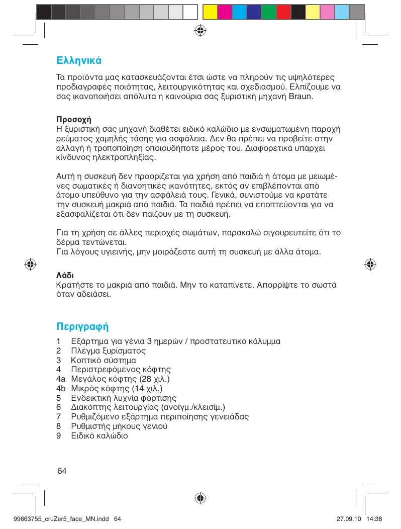 Eλληνικά Τα προϊόντα μας κατασκευάζονται έτσι ώστε να πληρούν τις υψηλότερες προδιαγραφές ποιότητας, λειτουργικότητας και σχεδιασμού. Ελπίζουμε να σας ικανοποιήσει απόλυτα η καινούρια σας ξυριστική μηχανή Braun. Η ξυριστική σας μηχανή διαθέτει ειδικό καλώδιο με ενσωματωμένη παροχή ρεύματος χαμηλής τάσης για ασφάλεια. Δεν θα πρέπει να προβείτε στην αλλαγή ή τροποποίηση οποιουδήποτε μέρος του. Διαφορετικά υπάρχει κίνδυνος ηλεκτροπληξίας. Αυτή η συσκευή δεν προορίζεται για χρήση από παιδιά ή άτομα με μειωμένες σωματικές ή διανοητικές ικανότητες, εκτός αν επιβλέπονται από άτομο υπεύθυνο για την ασφάλειά τους. Γενικά, συνιστούμε να κρατάτε την συσκευή μακριά από παιδιά. Τα παιδιά πρέπει να εποπτεύονται για να εξασφαλίζεται ότι δεν παίζουν με τη συσκευή. Για τη χρήση σε άλλες περιοχές σωμάτων, παρακαλώ σιγουρευτείτε ότι το δέρμα τεντώνεται. Για λόγους υγιεινής, μην μοιράζεστε αυτή τη συσκευή με άλλα άτομα. Κρατήστε το μακριά από παιδιά. Μην το καταπίνετε. Απορρίψτε το σωστά όταν αδειάσει.