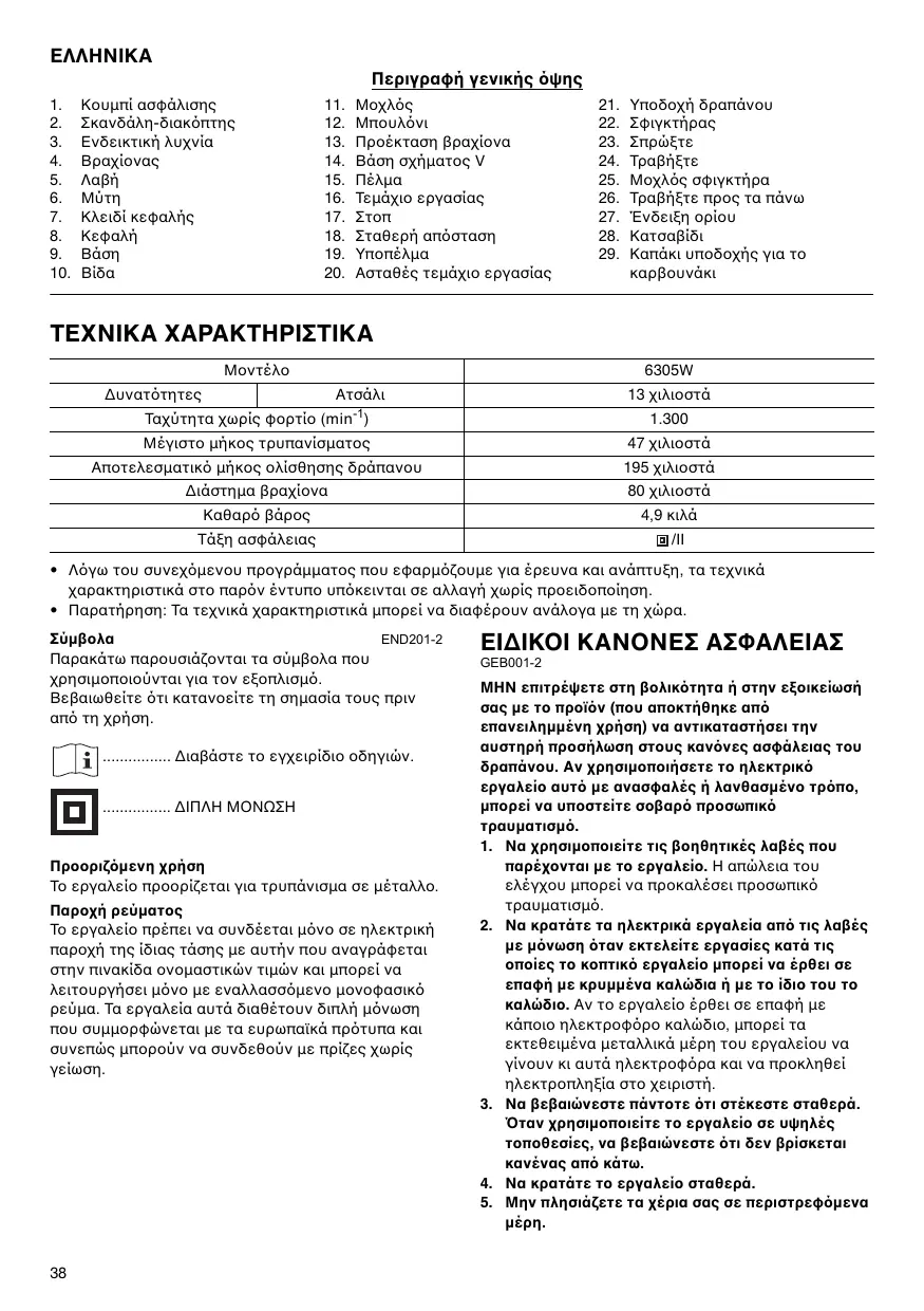 - Παρατήρηση: Τα τεχνικά χαρακτηριστικά µπορεί να διαφέρουν ανάλογα µε τη χώρα. END201-2 Παρακάτω παρουσιάζονται τα σύµβολα που χρησιµοποιούνται για τον εξοπλισµ. Βεβαιωθείτε τι κατανοείτε τη σηµασία τους πριν απ τη χρήση. ................ ∆ιαβάστε το εγχειρίδιο οδηγιών. ................ ∆ΙΠΛΗ ΜΟΝΩΣΗ Προοριζµενη χρήση Το εργαλείο προορίζεται για τρυπάνισµα σε µέταλλο. Παροχή ρεύµατος Το εργαλείο πρέπει να συνδέεται µνο σε ηλεκτρική παροχή της ίδιας τάσης µε αυτήν που αναγράφεται στην πινακίδα ονοµαστικών τιµών και µπορεί να λειτουργήσει µνο µε εναλλασσµενο µονοφασικ ρεύµα. Τα εργαλεία αυτά διαθέτουν διπλή µνωση που συµµορφώνεται µε τα ευρωπαϊκά πρτυπα και συνεπώς µπορούν να συνδεθούν µε πρίζες χωρίς