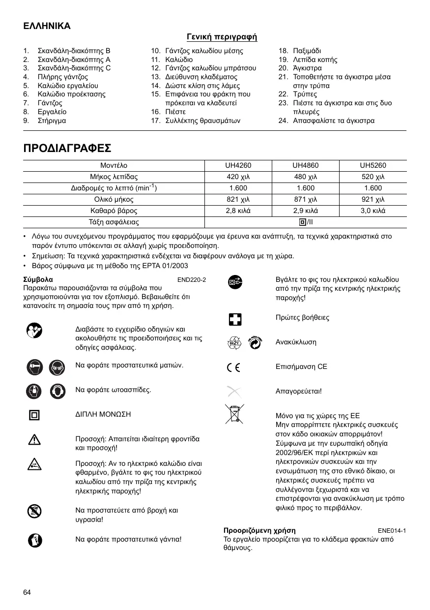 - Βάρος σύμφωνα με τη μέθοδο της EPTA 01/2003 END220-2 Παρακάτω παρουσιάζονται τα σύμβολα που χρησιμοποιούνται για τον εξοπλισμό. Βεβαιωθείτε ότι κατανοείτε τη σημασία τους πριν από τη χρήση. Βγάλτε το φις του ηλεκτρικού καλωδίου από την πρίζα της κεντρικής ηλεκτρικής Πρώτες βοήθειες Διαβάστε το εγχειρίδιο οδηγιών και ακολουθήστε τις προειδοποιήσεις και τις οδηγίες ασφάλειας. Να φοράτε προστατευτικά ματιών. Επισήμανση CE Να φοράτε ωτοασπίδες. Απαγορεύεται! ΔΙΠΛΗ ΜΟΝΩΣΗ Μόνο για τις χώρες της ΕΕ Μην απορρίπτετε ηλεκτρικές συσκευές στον κάδο οικιακών απορριμάτον! Σύμφωνα με την ευρωπαϊκή οδηγία 2002/96/ΕΚ περί ηλεκτρικών και ηλεκτρονικών συσκευών και την ενσωμάτωση της στο εθνικό δίκαιο, οι ηλεκτρικές συσκευές πρέπει να συλλέγονται ξεχωριστά και να επιστρέφονται για ανακύκλωση με τρόπο φιλικό προς το περιβάλλον. Προσοχή: Απαιτείται ιδιαίτερη φροντίδα και προσοχή! Προσοχή: Αν το ηλεκτρικό καλώδιο είναι φθαρμένο, βγάλτε το φις του ηλεκτρικού καλωδίου από την πρίζα της κεντρικής ηλεκτρικής παροχής! Να προστατεύετε από βροχή και Να φοράτε προστατευτικά γάντια!