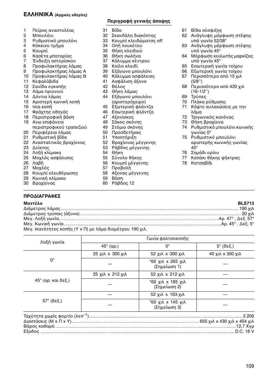 Εξάγωνο μπουλνι (αριστερχειρο) Εξωτερική φλάντζα Εσωτερική φλάντζα Σάκος σκνης Στμιο σκνης Προσδετήρας Βραχίονας μέγγενης Ράβδος μέγγενης Σύνολο θήκης Κουμπί μέγγενης Αξονας μέγγενης Ράβδος 12 61 Βίδα σύσφιξης 62 Ανάγλυφη μρφωση στέψης υπ γωνία 52/38° 63 Ανάγλυφη μρφωση στέψης υπ γωνία 45° 64 Μρφωση κοιλωτής μαρκίζας υπ γωνία 45° 65 Εσωτερική γωνία τοίχου 66 Εξωτερική γωνία τοίχου 67 Περισστερο απ 15 χιλ (5/8”) 68 Περισστερο απ 420 χιλ (16-1/2”) 69 Τρύπες 70 Πλάκα ρύθμισης 71 Κψτε αυλακώσεις με την 72 Τριγωνικς καννας 73 Θήκη βραχίονα 74 Ρυθμιστικ μπουλνι κωνικής γωνίας 0° 75 Ρυθμιστικ μπουλνι αριστερής κωνικής γωνίας 45° 76 Σημάδι ορίου 77 Καπάκι θήκης ψήκτρας 78 Κατσαβίδι ΠΡΟΔΙΑΓΡΑΦΕΣ BLS713 Διάμετρος λάμας................................................................................................................................................ 190 χιλ Διάμετρος τρύπας (άξονα) .................................................................................................................................. 20 χιλ Μεγ. Λοξή γωνία.................................................................................................................................Αρ. 47° , Δεξ. 57° Μεγ. Κωνική γωνία ...............................................................................................................................Αρ. 45° , Δεξ. 5° Μεγ. Ικαντητες κοπής (Υ x Π) με λάμα διαμέτρου 190 χιλ.