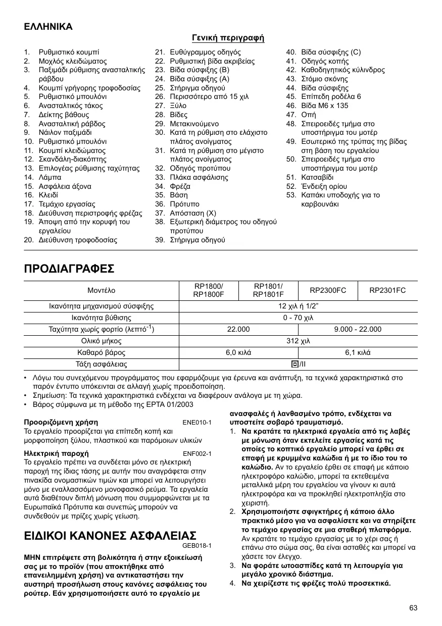 5. Perno de ajuste 25. Soporte de la guia 42. Rodillo guia 6. Bloque de tope 26. Més de 15 mm 43. Boquilla de polvo 7. Indicador de profundidad 27. Madera 44. Tomillo de apriete 8. Varilla de tope 28. Tornillos 45. Arandela plana 6 9. Tuerca de nylon 29. Môvil 46. Torillo M6 x 135 10. Perno de ajuste 30. Cuando se ajusta en el ancho de 47. Orificio 11. Botôn de bloqueo apertura minimo 48. Parte con rosca del soporte del 12. Interruptor disparador 31. Cuando se ajusta en el ancho de motor 13. Dial de regulaciôn de la velocidad apertura mäximo 49. Interior del orificio para el tomill 14. Lämpara 32. Guia para plantilla de la base de la herramienta 15. Bloqueo del eje 33. Placa de bloqueo 50. Parte con rosca del soporte del 16. Liave 34. Fresa motor 17. Pieza de trabajo 35. Base 51. Destornillador 18. Direcciôn de giro de la fresa 36. Plantila 52. Marca de limite 19. Vista desde la parte superior de la 37. Distancia (X) 53. Tapa del portaescobillas herramienta ESPECIFICACIONES RP1800/ RP1801/ Modelo RP 1800 RPABOIE RP2300FC RP2301FC Capacidad de boquilla 12 mm o 12° Capacidad de penetraciôn 0-70 mm Velocidad en vacio (min 1) 22.000 Ï 9.000 - 22.000 Observe si se producen vibraciones u oscilaciones, puesto que son sintomas de que la fresa no se ha instalado correctamente.