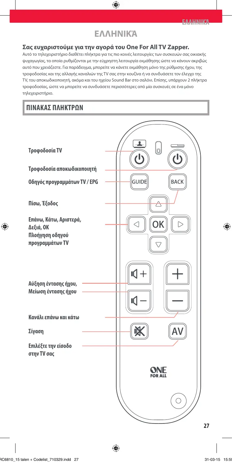 Téléchargez la notice de votre Παντοδύναμο τηλεχειριστήριο au format PDF gratuitement ! Retrouvez votre notice URC6810 - ONE FOR ALL et reprennez votre appareil électronique en main. Sur cette page sont publiés tous les documents nécessaires à l'utilisation de votre appareil URC6810 de la marque ONE FOR ALL.