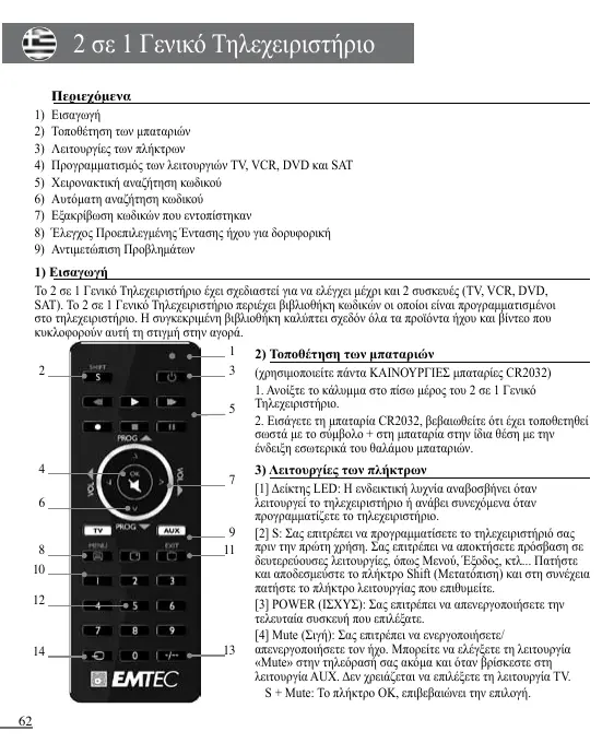 Το 2 σε 1 Γενικό Τηλεχειριστήριο έχει σχεδιαστεί για να ελέγχει μέχρι και 2 συσκευές (TV, VCR, DVD, SAT). Το 2 σε 1 Γενικό Τηλεχειριστήριο περιέχει βιβλιοθήκη κωδικών οι οποίοι είναι προγραμματισμένοι στο τηλεχειριστήριο. Η συγκεκριμένη βιβλιοθήκη καλύπτει σχεδόν όλα τα προϊόντα ήχου και βίντεο που κυκλοφορούν αυτή τη στιγμή στην αγορά. 1 2) Τοποθέτηση των μπαταριών 3 (χρησιμοποιείτε πάντα ΚΑΙΝΟΥΡΓΙΕΣ μπαταρίες CR2032)