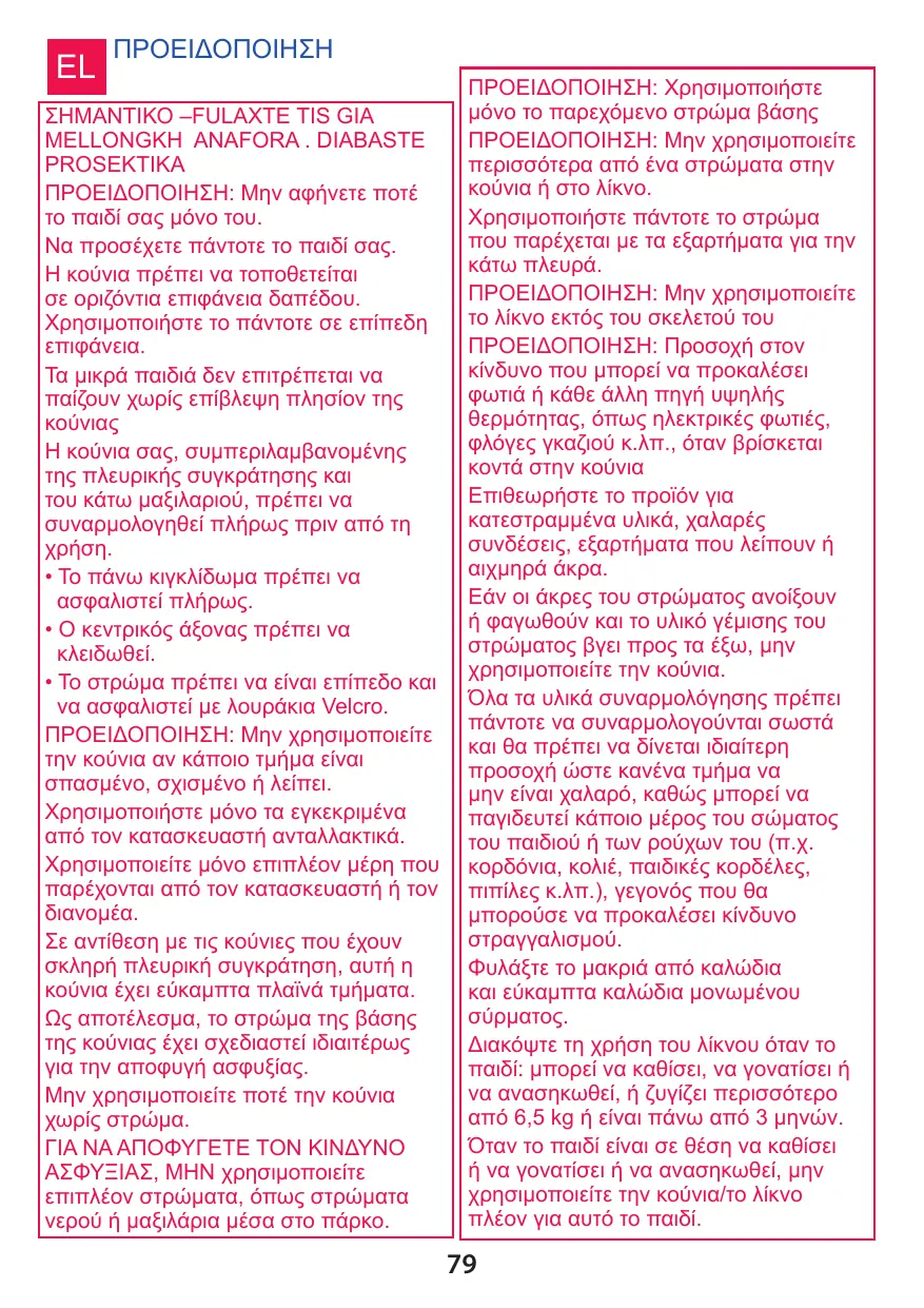 AVERTISSEMENT: Ne pas utiliser plus d’un matelas à la fois dans le berceau ou dans le rehausseur de matelas. Toujours utiliser le matelas sommier fourni, en le fixant avec les sangles situées en dessous. AVERTISSEMENT: Ne pas utiliser le rehausseur de matelas hors du berceau AVERTISSEMENT: Attention aux accidents liés aux flammes et autres sources de forte chaleur telles que radiateurs électriques, ou radiateurs à gaz, dans le voisinage du berceau. Vérifier le berceau pour détecter les parties abimées ou manquantes, et les bords acérés. Si les bords rembourrés sont déchirés et donnent un accès au rembourrage il faut arrêter d’utiliser le berceau. Tous les dispositifs de fixation doivent être correctement attachés. Faire attention à ce que le bébé n’ait pas une partie de son corps ou de ses vêtements (rubans, colliers) coincés, entrainant un risque d’étranglement. Mettre le berceau loin des cordons de téléphones ou de fils électriques. Arrêtez d’utiliser le rehausseur de matelas lorsque l’enfant vérifie une des conditions suivantes: l’enfant peut s’asseoir, se mettre à genoux ou se redresser tout seul, ou, à partir du moment où il pèse plus de 6,5 kg ou a plus de 3 mois. Lorsqu’un enfant est capable de s’asseoir, ou de se mettre à genoux, ou de se redresser tout seul, le berceau ne doit plus être utilisé pour cet enfant. Arrêtez d’utiliser le berceau lorsque l’enfant mesure 70 cm ou pèse plus de 8kg.