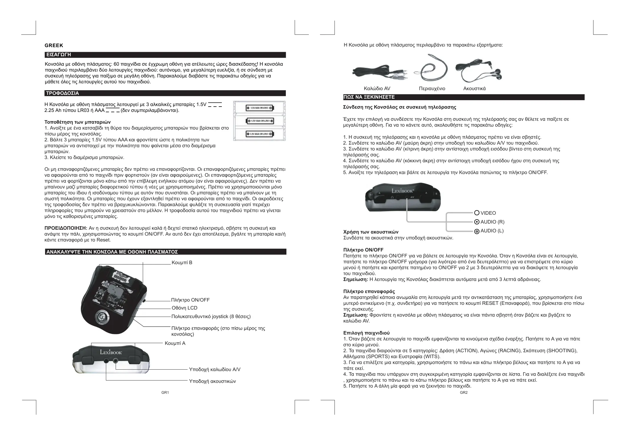 Oi επαναφορτιόμενς μΠαταρίες δεν πρέτηινα επαναφορτιόμενται. OI επαναφορτιόμενς μΠαταρίες πρέτηινα αφαρουνται έτο το παιχίδι πρίν φορτιούν (av εἶνα αφαρουμενες). OI επαναφορτιόμενς μΠαταρίες πρέτηινα αφορτιόνται Μόνο κάτω έτο ηήν επίβλεψη ευήλίου ατόμου (av εἶνα αφαρουμενες). Δεν πρέτηινα μπαίουν μαζι μΠαταρίες διαφορετικόν τúτου ἡνες με χροσιμοῦπιμενες. πρέτηινα εχροσιμοῦτούνται Μόνο μΠαταρίες του Αίου έπούνυμου Κύτου με αὐτόν του συμίσται. OI μΠαταρίες πρέτηινα μπαίουν με τη σωτή πολίκόπται. OI μΠαταρίες του ἡχουν ἐξαντλήθεί πρέτηινα αφαρουνται έτο το παιχίδι. OI ακροδέκτες της τροφοδοσίας δεν πρέτηινα βραχukukλωνονται. Παρακαλόμε φυλάξε η το συκευσία γιαι περίχει πληροφορίες του μθρούν vα χρειστούν στο μέλλον. H τροφοδοσία αutou του παιχίδιού μρέτηινα γένειται Μόνο τις καθορίσμενες μΠαταρίες.