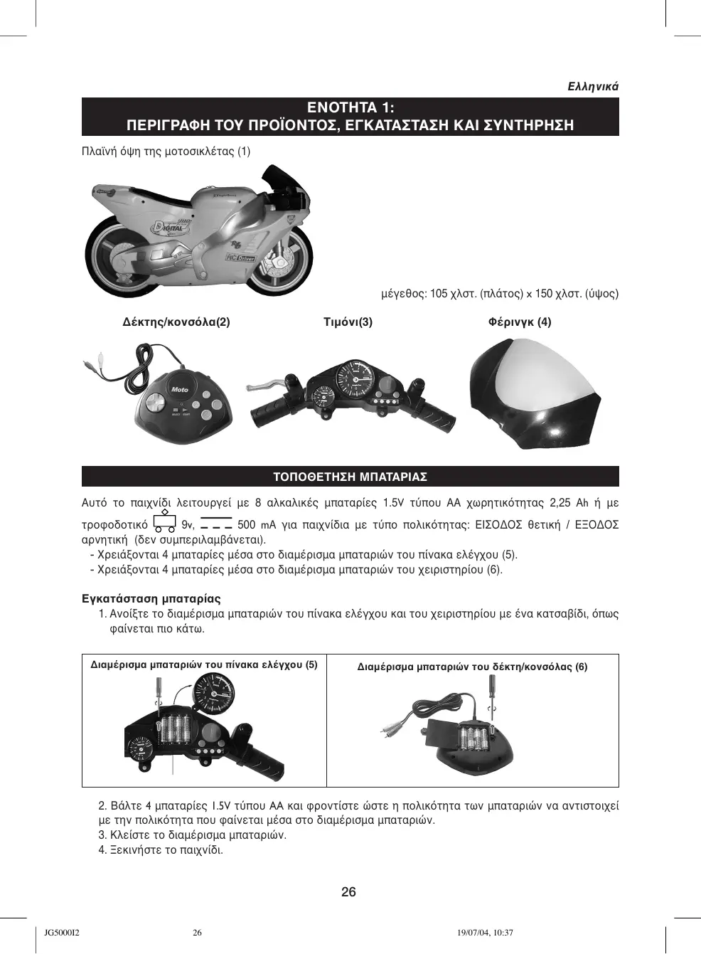 ΤΠΘΕΤΗΣΗ ΜΠΑΤΑΡΙΑΣ Αυτ τ παινδι λειτυργε µε 8 αλκαλικ µπαταρε 1.5V τπυ AA ωρητικτητα 2,25 Ah µε τρδτικ 9v, 500 mA για παινδια µε τπ πλικτητα: ΕΙΣ∆Σ θετικ / Ε∆Σ αρνητικ (δεν συµπεριλαµνεται). - ρεινται 4 µπαταρε µσα στ διαµρισµα µπαταριν τυ πνακα ελγυ (5). - ρεινται 4 µπαταρε µσα στ διαµρισµα µπαταριν τυ ειριστηρυ (6). Εγκατσταση µπαταρα 1. Αντε τ διαµρισµα µπαταριν τυ πνακα ελγυ και τυ ειριστηρυ µε να κατσαδι, πω ανεται πι κτω. ∆ιαµρισµα µπαταριν τυ πνακα ελγυ (5)