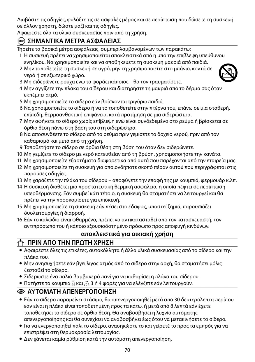 A ΣΗΜΑΝΤΙΚA ΜEΤΡΑ ΑΣΦAΛΕΙΑΣ Τηρείτε τα βασικά μέτρα ασφάλειας, συμπεριλαμβανομένων των παρακάτω: 1 Η συσκευή πρέπει να χρησιμοποιείται αποκλειστικά από ή υπό την επίβλεψη υπεύθυνου ενηλίκου. Να χρησιμοποιείτε και να αποθηκεύετε τη συσκευή μακριά από παιδιά. 2 Μην τοποθετείτε τη συσκευή σε υγρό, μην τη χρησιμοποιείτε στο μπάνιο, κοντά σε νερό ή σε εξωτερικό χώρο. 3 Μη σιδερώνετε ρούχα ενώ τα φοράει κάποιος – θα τον τραυματίσετε. 4 Μην αγγίζετε την πλάκα του σίδερου και διατηρήστε τη μακριά από το δέρμα σας όταν εκπέμπει ατμό. 5 Μη χρησιμοποιείτε το σίδερο εάν βρίσκονται τριγύρω παιδιά. 6 Να χρησιμοποιείτε το σίδερο ή να το τοποθετείτε στην πτέρνα του, επάνω σε μια σταθερή, επίπεδη, θερμοανθεκτική επιφάνεια, κατά προτίμηση σε μια σιδερώστρα. 7 Μην αφήνετε το σίδερο χωρίς επίβλεψη ενώ είναι συνδεδεμένο στο ρεύμα ή βρίσκεται σε όρθια θέση πάνω στη βάση του στη σιδερώστρα. 8 Να αποσυνδέετε το σίδερο από το ρεύμα πριν γεμίσετε το δοχείο νερού, πριν από τον καθαρισμό και μετά από τη χρήση. 9 Τοποθετήστε το σίδερο σε όρθια θέση στη βάση του όταν δεν σιδερώνετε. 10 Μη γεμίζετε το σίδερο με νερό κατευθείαν από τη βρύση, χρησιμοποιήστε την κανάτα. 11 Μη χρησιμοποιείτε εξαρτήματα διαφορετικά από αυτά που παρέχονται από την εταιρεία μας. 12 Μη χρησιμοποιείτε τη συσκευή για οποιονδήποτε σκοπό πέραν αυτού που περιγράφεται στις παρούσες οδηγίες. 13 Μη χαράζετε την πλάκα του σίδερου – αποφύγετε την επαφή της με κουμπιά, φερμουάρ κ.λπ. 14 Η συσκευή διαθέτει μια προστατευτική θερμική ασφάλεια, η οποία πέφτει σε περίπτωση υπερθέρμανσης. Εάν συμβεί κάτι τέτοιο, η συσκευή θα σταματήσει να λειτουργεί και θα πρέπει να την προσκομίσετε για επισκευή. 15 Μη χρησιμοποιείτε τη συσκευή εάν πέσει στο έδαφος, υποστεί ζημιά, παρουσιάζει δυσλειτουργίες ή διαρροή. 16 Εάν το καλώδιο είναι φθαρμένο, πρέπει να αντικατασταθεί από τον κατασκευαστή, τον αντιπρόσωπό του ή κάποιο εξουσιοδοτημένο πρόσωπο προς αποφυγή κινδύνων.