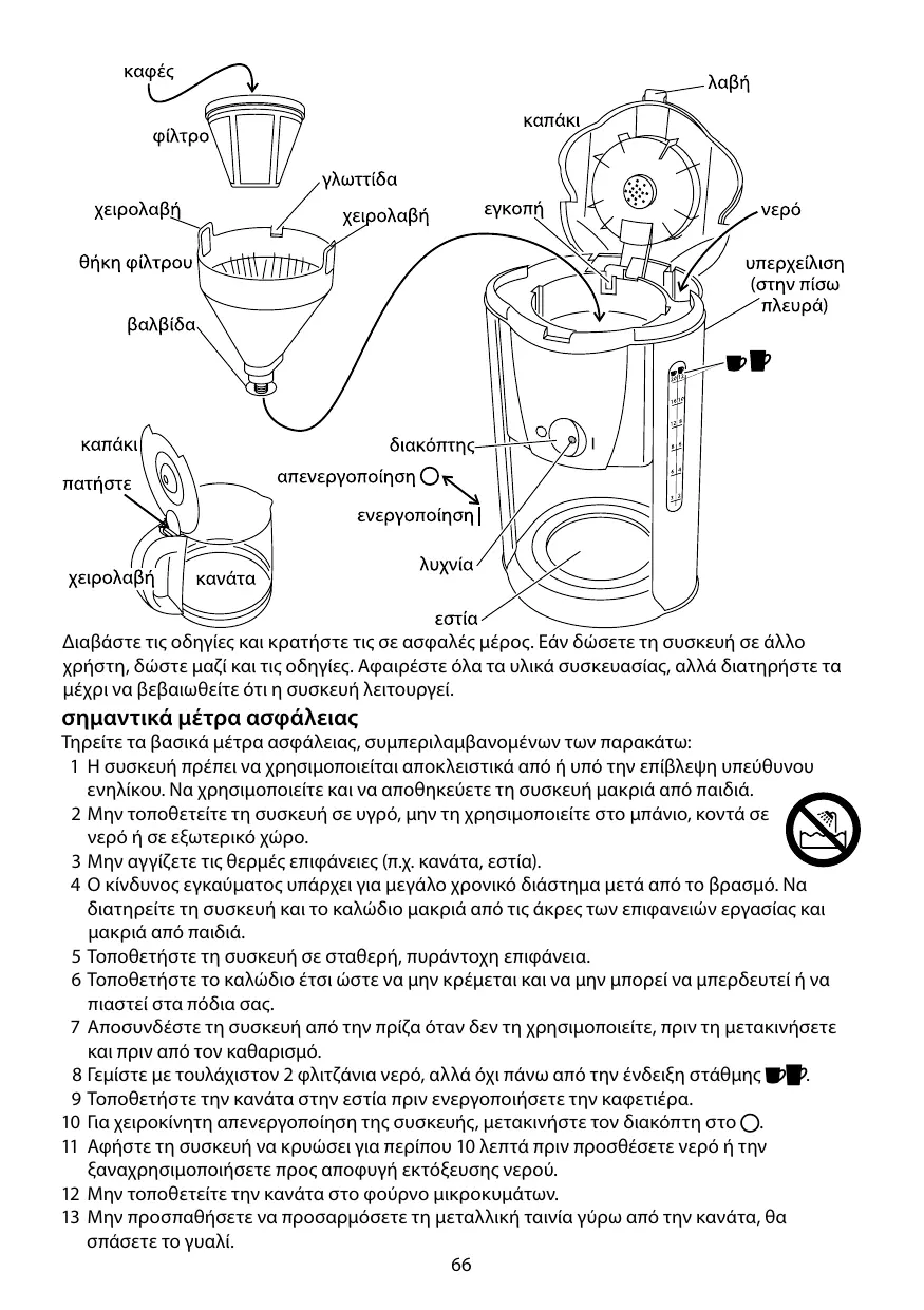 σημαντικά μέτρα ασφάλειας Τηρείτε τα βασικά μέτρα ασφάλειας, συμπεριλαμβανομένων των παρακάτω: 1 Η συσκευή πρέπει να χρησιμοποιείται αποκλειστικά από ή υπό την επίβλεψη υπεύθυνου ενηλίκου. Να χρησιμοποιείτε και να αποθηκεύετε τη συσκευή μακριά από παιδιά. 2 Μην τοποθετείτε τη συσκευή σε υγρό, μην τη χρησιμοποιείτε στο μπάνιο, κοντά σε νερό ή σε εξωτερικό χώρο. 3 Μην αγγίζετε τις θερμές επιφάνειες (π.χ. κανάτα, εστία). 4 Ο κίνδυνος εγκαύματος υπάρχει για μεγάλο χρονικό διάστημα μετά από το βρασμό. Να διατηρείτε τη συσκευή και το καλώδιο μακριά από τις άκρες των επιφανειών εργασίας και μακριά από παιδιά. 5 Τοποθετήστε τη συσκευή σε σταθερή, πυράντοχη επιφάνεια. 6 Τοποθετήστε το καλώδιο έτσι ώστε να μην κρέμεται και να μην μπορεί να μπερδευτεί ή να πιαστεί στα πόδια σας. 7 Αποσυνδέστε τη συσκευή από την πρίζα όταν δεν τη χρησιμοποιείτε, πριν τη μετακινήσετε και πριν από τον καθαρισμό. 8 Γεμίστε με τουλάχιστον 2 φλιτζάνια νερό, αλλά όχι πάνω από την ένδειξη στάθμης ;:. 9 Τοποθετήστε την κανάτα στην εστία πριν ενεργοποιήσετε την καφετιέρα. 10 Για χειροκίνητη απενεργοποίηση της συσκευής, μετακινήστε τον διακόπτη στο 0. 11 Αφήστε τη συσκευή να κρυώσει για περίπου 10 λεπτά πριν προσθέσετε νερό ή την ξαναχρησιμοποιήσετε προς αποφυγή εκτόξευσης νερού. 12 Μην τοποθετείτε την κανάτα στο φούρνο μικροκυμάτων. 13 Μην προσπαθήσετε να προσαρμόσετε τη μεταλλική ταινία γύρω από την κανάτα, θα σπάσετε το γυαλί. 66