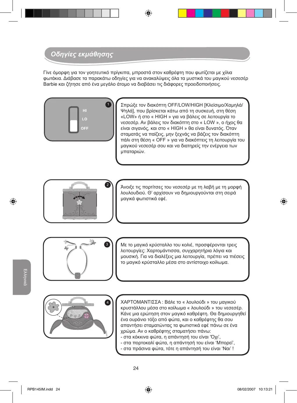 RPB1IM.indd 2 0/02/200 10:1:20 Οδηγίες εκμάθησης Γίνε όμορφη για τον γοητευτικό πρίγκιπα, μπροστά στον καθρέφτη που φωτίζεται με χίλια φωτάκια. Διάβασε τα παρακάτω οδηγίες για να ανακαλύψεις όλα τα μυστικά του μαγικού νεσεσέρ Barbie και ζήτησε από ένα μεγάλο άτομο να διαβάσει τις διάφορες προειδοποιήσεις. Σπρώξε τον διακόπτη OFF/LOW/HIGH [Κλείσιμο/Χαμηλά/ Ψηλά], που βρίσκεται κάτω από τη συσκευή, στη θέση «LOW» ή στο « HIGH » για να βάλεις σε λειτουργία το νεσεσέρ. Αν βάλεις τον διακόπτη στο « LOW », ο ήχος θα είναι σιγανός, και στο « HIGH » θα είναι δυνατός. Όταν σταματάς να παίζεις, μην ξεχνάς να βάζεις τον διακόπτη πάλι στη θέση « OFF » για να διακόπτεις τη λειτουργία του μαγικού νεσεσέρ σου και να διατηρείς την ενέργεια των
