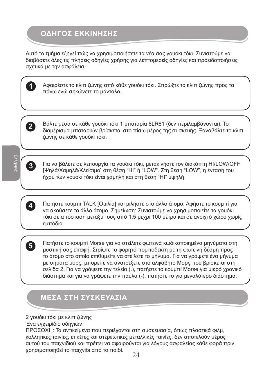 Πατήστε το κουμπί Morse για να στείλετε φωτεινά κωδικοποιημένα μηνύματα στη μυστική σας επαφή. Στρίψτε το φορητό πομποδέκτη με τη φωτεινή δέσμη προς το άτομο στο οποίο επιθυμείτε να στείλετε το μήνυμα. Για να γράψετε ένα μήνυμα με σήματα μορς, μπορείτε να ανατρέξετε στο αλφάβητο Μορς που βρίσκεται στη σελίδα 2. Για να γράψετε την τελεία (.), πατήστε το κουμπί Morse για μικρό χρονικό διάστημα και για να γράψετε την παύλα (-), πατήστε το για μεγαλύτερο διάστημα. ΜΕΣΑ ΣΤΗ ΣΥΣΚΕΥΑΣΙΑ 2 γουόκι τόκι με κλιπ ζώνης Ένα εγχειρίδιο οδηγιών ΠΡΟΣΟΧΗ: Τα αντικείμενα που περιέχονται στη συσκευασία, όπως πλαστικά φιλμ, κολλητικές ταινίες, ετικέτες και στερεωτικές μεταλλικές ταινίες, δεν αποτελούν μέρος αυτού του παιχνιδιού και πρέπει να αφαιρούνται για λόγους ασφαλείας κάθε φορά πριν χρησιμοποιηθεί το παιχνίδι από το παιδί.