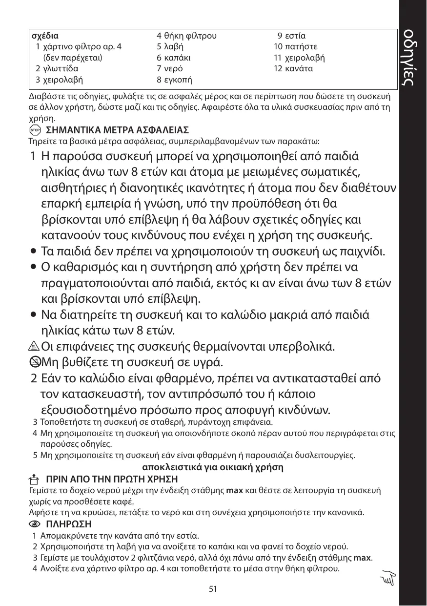 1 χάρτινο φίλτρο αρ. 4 (δεν παρέχεται) 2 γλωττίδα 3 χειρολαβή 9 εστία 10 πατήστε 11 χειρολαβή 12 κανάτα Διαβάστε τις οδηγίες, φυλάξτε τις σε ασφαλές μέρος και σε περίπτωση που δώσετε τη συσκευή σε άλλον χρήστη, δώστε μαζί και τις οδηγίες. Αφαιρέστε όλα τα υλικά συσκευασίας πριν από τη