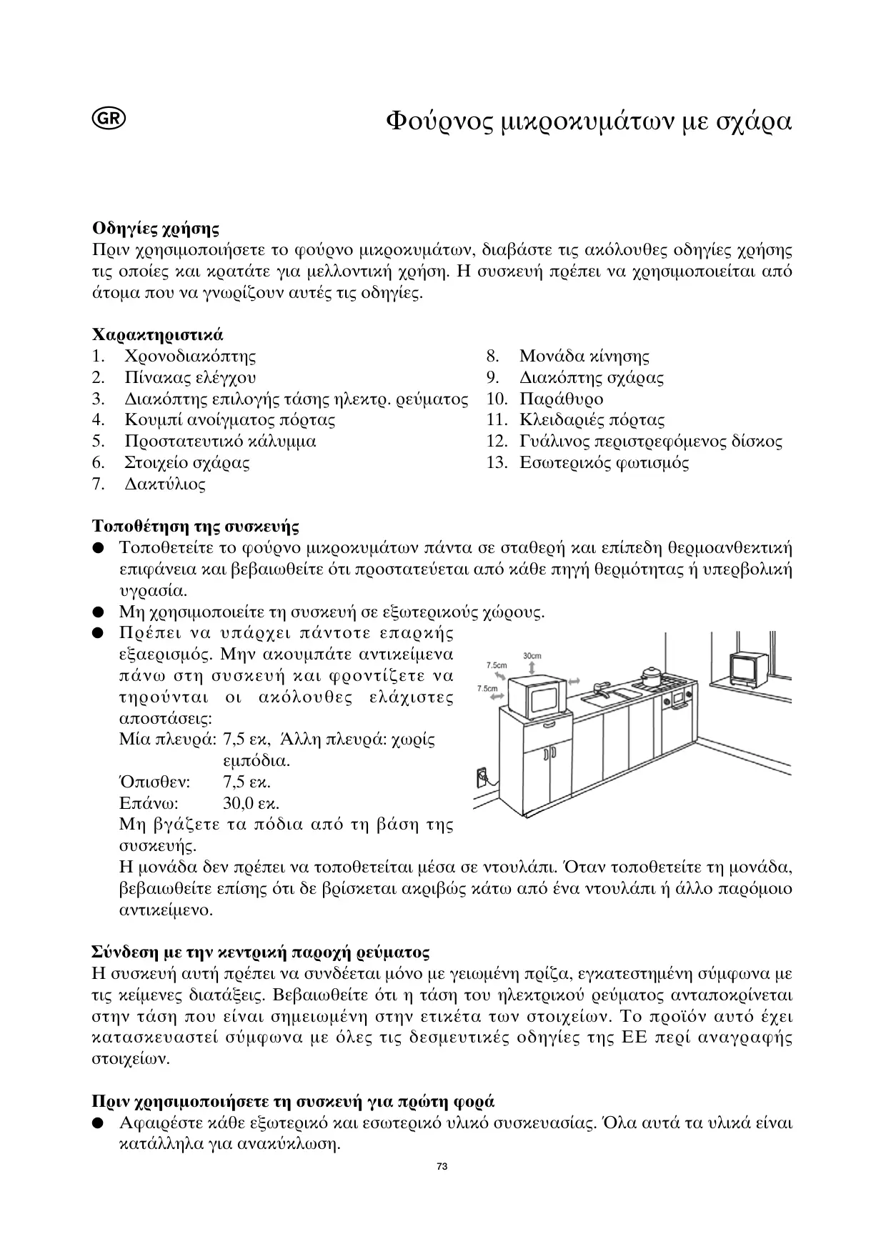 Mise en place de l’appareil ● Installez toujours le four à micro-ondes sur une surface stable et plane, résistante à la chaleur et à l’abri de toute source de chaleur ou d’humidité excessive. ● Abstenez-vous d’utiliser l’appareil en plein air. ● Une aération suffisante doit être constamment assurée. Ne placez aucun objet sur l’appareil et veillez à ce que les distances minimales suivantes soient respectées entre l’appareil et le mur ou tout autre objet: Un côté : 7.5 cm; sans obstruction de l'autre côté Arrière: 7.5 cm Hauteur: 30.0 cm Les pieds sous l’appareil ne doivent pas être enlevés. L’appareil ne doit pas être installé dans une armoire. Evitez aussi, au moment de mettre l’appareil en place, de l’installer immédiatement sous une armoire ou tout autre objet analogue. Connexion au secteur L’appareil doit être branché exclusivement sur une prise de courant avec terre, installée selon les normes. Assurez-vous que la tension d’alimentation correspond à la tension indiquée sur la plaque signalétique. Ce produit est conforme aux directives obligatoires inhérentes au marquage CE. Avant d’utiliser l’appareil ● Otez tout emballage externe et interne. Les matériaux d’emballage utilisés se prêtent au