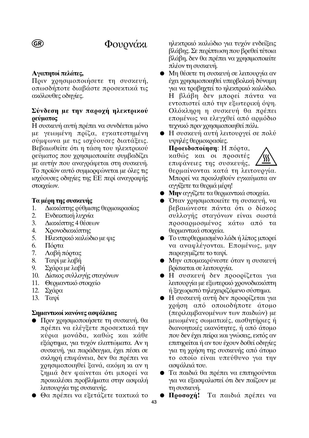 - Na χοημοσοιείτε πάντα τη λαβή της πόθτας γιαν ανοίξετε τη ζεούτη γυλινη πόθτα μετά τη λειτουγία. 'Οταν αφαμείτε το ταψή φησματος ἡ τη σχάρα, να χοημοσοιείτε τη λαβή ταψιούν που παδέχεται. Oμοίως, ὄταν αφαμείτε την πεώτοεφόμενη σουβλα, ποδεπιν αχονμοσοιείτε τη λαβή της σουβλας. Na τοποθείτε πάντοτε το ταψή σε επιφάνειες που αντέχουν στη θεμότητα.