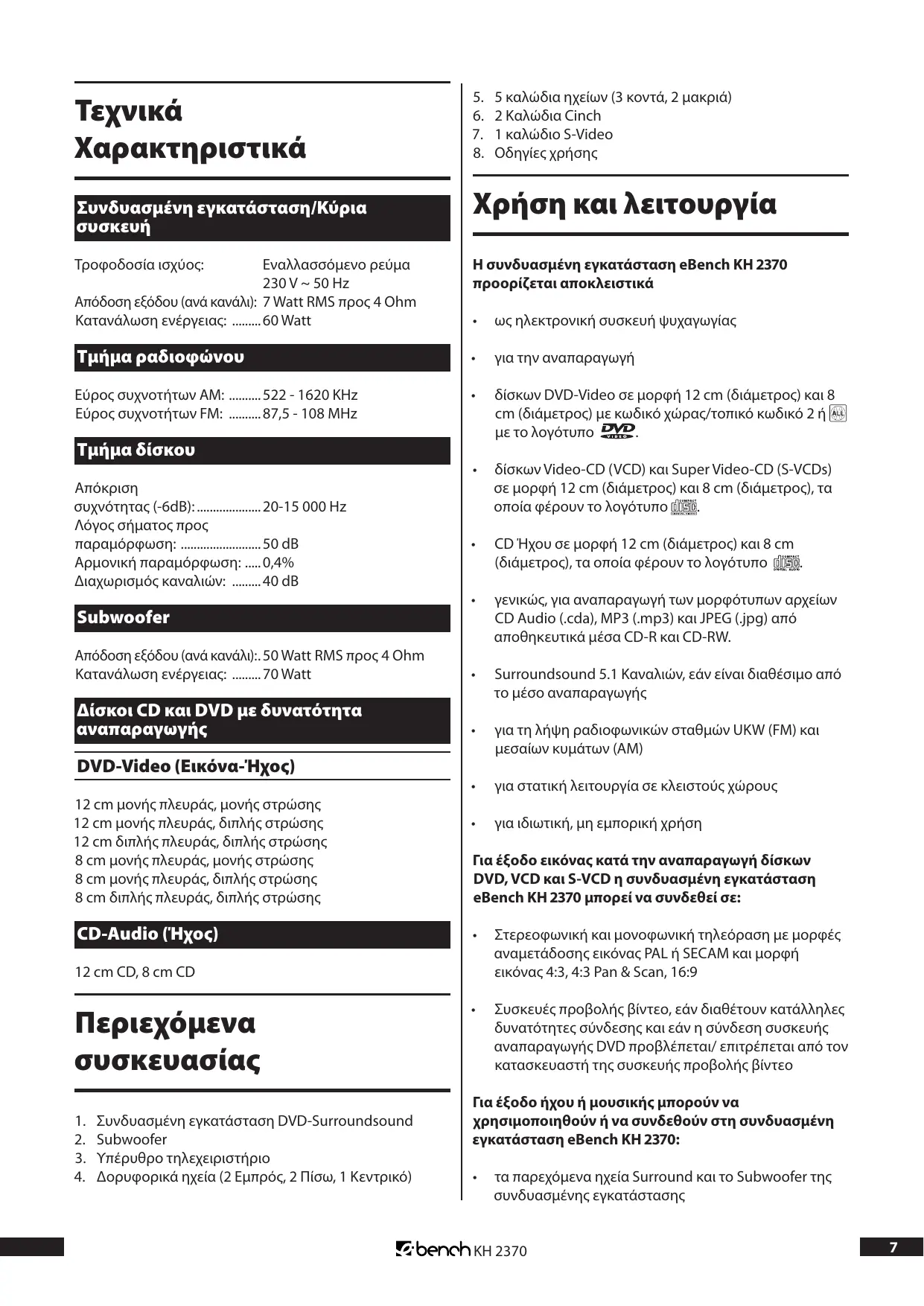 Κατεβάστε τις οδηγίες για το Σύστημα οικιακού κινηματογράφου σε μορφή PDF δωρεάν! Βρείτε το εγχειρίδιό σας KH 2370 DVD SURROUND SOUND COMBINATION UNIT - EBENCH και πάρτε ξανά την ηλεκτρονική σας συσκευή στα χέρια σας. Σε αυτή τη σελίδα δημοσιεύονται όλα τα έγγραφα που απαιτούνται για τη χρήση της συσκευής σας. KH 2370 DVD SURROUND SOUND COMBINATION UNIT της μάρκας EBENCH.