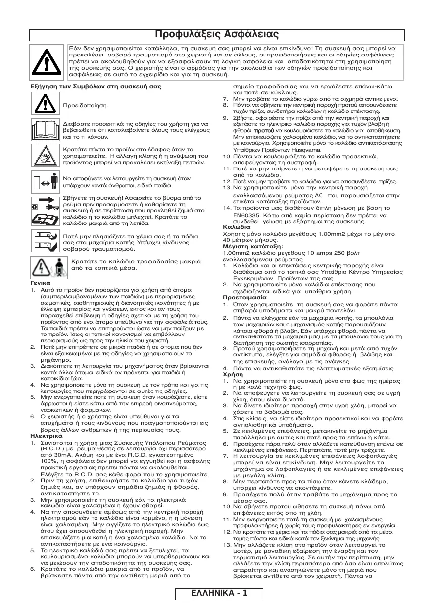 στη συσκευή ή στη συσκευασία του δείχνει ότι αυτή η συσκευή δεν µπορεί να επεξεργαστεί ως οικιακά απόβλητα. Αντί αυτού θα παραδοθεί στο κατάλληλο σηµείο συλλογής για την ανακύκλωση του ηλεκτρικού και ηλεκτρονικού εξοπλισµού. Με την εξασφάλιση ότι αυτή τη συσκευή πετάγεται σωστά, θα βοηθήσετε να αποτρέψετε τις πιθανές αρνητικές συνέπειες για το περιβάλλον και την ανθρώπινη υγεία, τα οποία θα µπορούσαν να προκληθούν µε τον ακατάλληλο χειρισµό αποβλήτων αυτής της συσκευής. Για περισσότερες αναλυτικές πληροφορίες για την ανακύκλωση αυτής συσκευής, παρακαλώ ελάτε σε επαφή µε το τοπικό γραφείο του ∆ηµαρχείου σας, την υπηρεσία διάθεσης οικιακών αποβλήτων σας ή το κατάστηµα όπου αγοράσατε τη συσκευή. Εγγύηση και Πολιτική Εγγύησης Εάν τυχόν µέρος βρεθεί ελαττωµατικό λόγω ελαττωµατικής κατασκευής εντός της εγγυητικής περιόδου, η Husqvarna UK Ltd., µέσω των Εξουσιοδοτηµένων Υπηρεσίας Επισκευών της θα εκτελέσουν την επισκευή ή την δωρεάν αντικατάσταση στους πελάτες, δεδοµένου ότι: (α) Το ελάττωµα αναφέρεται άµεσα στον Εξουσιοδοτηµένο Επιδιορθωτή. (β) Χορηγείται απόδειξη της αγοράς. (γ) Το ελάττωµα δεν προκαλείται από κακή χρήση, παραµέληση ή ελαττωµατική ρύθµιση από το χρήστη. (δ) Η αµέλεια δεν έχει εµφανιστεί µέσω της κανονικής φθοράς λόγω χρήσης. (ε) Η µηχανή δεν έχει συντηρηθεί ή έχει επισκευαστεί, δεν έχει αποσυναρµολογηθεί ή έχει πειραχτεί από τυχόν πρόσωπο που δεν εγκρίνεται από την Husqvarna UK Ltd. Η µηχανή δεν έχει χρησιµοποιηθεί για µίσθωση. Η µηχανή είναι ιδιοκτησία του αρχικού αγοραστή. Η µηχανή δεν έχει χρησιµοποιηθεί για εµπορικούς σκοπούς. Αυτή η εγγύηση είναι πρόσθετη, και σε καµία περίπτωση δεν καταργεί τα νοµικά δικαιώµατα του πελάτη. Παραλείψεις λόγω των ακόλουθων δεν καλύπτονται, εποµένως είναι σηµαντικό όπως διαβάσετε τις οδηγίες που περιλαµβάνονται σε αυτό το εγχειρίδιο του χειριστή και καταλαβαίνετε πώς να ενεργοποιήσετε και να διατηρήσετε τη