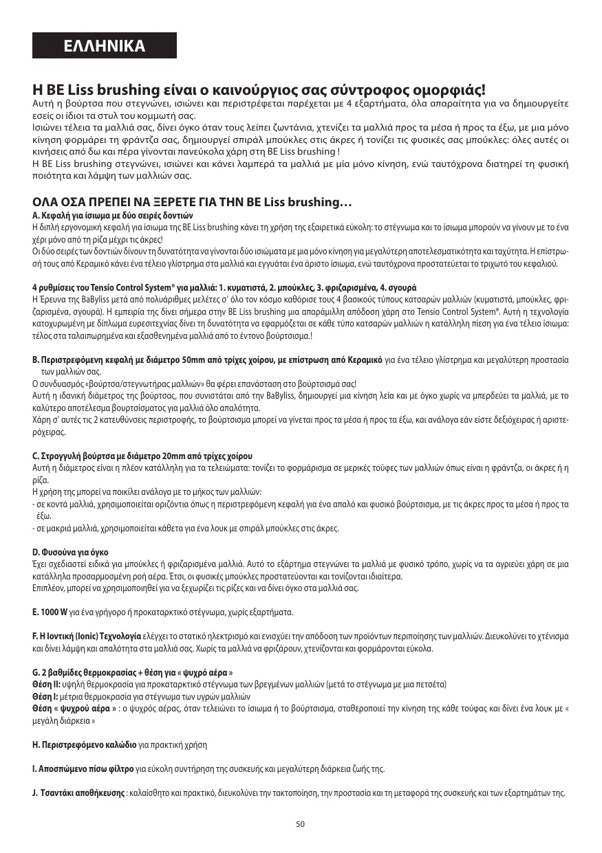 La double tête lissante ergonomique de BE Liss brushing rend son utilisation particulièrement aisée : le séchage et le lissage peuvent se faire avec une seule main de la racine aux pointes! Les deux rangées de dents permettent deux lissages en un seul geste pour plus d’efficacité et de rapidité. Leur revêtement Ceramic offre une glisse parfaite sur le cheveu et garantit un lissage optimal, dans le respect total de la fibre capillaire. Tensio Control System® 4 réglages : 1. ondulés, 2. bouclés, 3. frisés, 4. crépus La Recherche BaByliss a déterminé par de nombreuses études à travers le monde l’existence de 4 types fondamentaux de frisure (ondulé, bouclé, frisé, crépu). Son expertise permet aujourd’hui d’apporter à BE Liss brushing une performance inégalée grâce au Tensio Control System®. Cette technologie brevetée permet d’adapter à chacun des types de frisure la tension adéquate pour un lissage parfait : finis les tiraillements et les cheveux arrachés lors de brushings trop laborieux ! B. L a tête rotative diamètre 50mm en poils de sanglier, avec revêtement Ceramic pour une glisse parfaite et une meilleure protection de votre cheveu. La combinaison « brosse/sèche-cheveux » va révolutionner votre geste brushing ! Ce diamètre de brosse idéal, recommandé par BaByliss, effectue un mouvement lisse et gonflant sans emmêler les cheveux, avec le meilleur résultat de brushing pour des cheveux plein de douceur. Grâce à ses 2 sens de rotation, le brushing peut se faire vers l’intérieur ou vers l’extérieur, que vous soyez droitière ou gauchère. C. La brosse ronde diamètre 20mm en poils de sanglier Ce diamètre est plus spécialement adapté pour les finitions : elle va accentuer la mise en forme de certaines mèches comme la frange, les pointes ou la racine. Son utilisation peut aussi varier selon la longueur de cheveux : - sur cheveux courts, elle s’utilisera horizontalement comme la tête rotative pour un brushing souple et naturel, avec effet intérieur ou extérieur. - sur cheveux longs, elle s’utilisera verticalement pour un effet boucles spirales sur les pointes. D. Le diffuseur volume Spécialement conçu pour les cheveux bouclés ou frisés, cet accessoire sèche les cheveux naturellement, sans les agresser grâce à un flux d’air adapté. Les boucles naturelles sont ainsi respectées et mises en valeur. De plus, il peut s’utiliser pour décoller la racine et donner du volume à vos cheveux. E. 1000 W pour un séchage ou un pré-séchage rapide, sans accessoire. F. La Technologie Ionic permet de maîtriser l’électricité statique et aussi de renforcer l’efficacité de soins capillaires non rincés. Elle facilite le coiffage et donne de la brillance et de la douceur à vos cheveux. Sans frisottis, ils seront plus faciles à coiffer et à mettre en forme. G. 2 niveaux de températures + position « air frais » P osition II : température élevée pour le pré-séchage des cheveux mouillés (après essorage avec une serviette) P osition I : température modérée pour le séchage des cheveux humides P osition « air frais » : le coup d’air frais en fin de lissage ou de brushing fixe le mouvement de chaque mèche et lui confère un effet « longue durée » H. Cordon rotatif pour une utilisation pratique I. Filtre arrière amovible pour un entretien facile de l’appareil et prolonger sa durée de vie J. Trousse de rangement : esthétique et pratique, elle facilite le rangement, la protection et le transport de l’appareil et de ses accessoires.