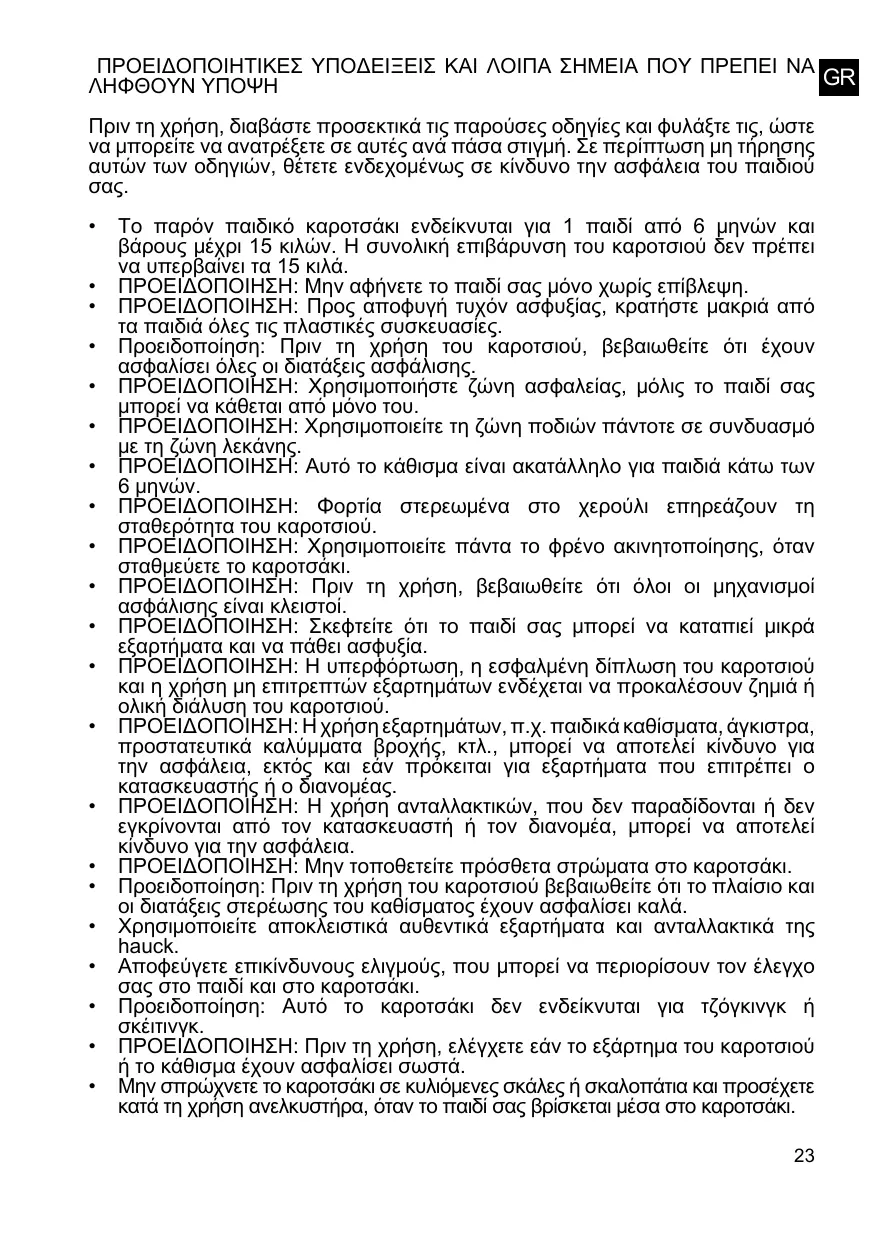 AVERTISSEMENT : conservez tous les conditionnements en plastique hors de portée des enfants en prévention de tout danger d‘asphyxie. Avertissement : assurez-vous que tous les dispositifs d‘arrêt de la poussette ont été correctement bloqués avant de vous en servir. AVERTISSEMENT : servez-vous d‘un harnais de sécurité dès que votre enfant peut se tenir assis tout seul. AVERTISSEMENT : servez-vous toujours de la ceinture entre les jambes en combinaison avec la ceinture pour la hanche. AVERTISSEMENT : cette assise n’est pas appropriée aux enfants de moins de 6 mois. AVERTISSEMENT : les charges suspendues au guidon ou aux cannes influencent la stabilité de la poussette. AVERTISSEMENT : utilisez impérativement les freins d‘arrêt lorsque vous immobilisez la poussette. AVERTISSEMENT : contrôlez toujours la fermeture correcte de tous les blocages et verrouillages avant emploi. AVERTISSEMENT : n‘oubliez jamais que votre enfant pourrait avaler les petites pièces et s‘asphyxier. AVERTISSEMENT : les surcharges, un repliage non conforme à l‘usage prévu et l‘emploi d‘accessoires non homologués peuvent endommager la poussette ou provoquer son effondrement. AVERTISSEMENT : l‘emploi d‘accessoires, tels les sièges pour enfant, crochets pour sacs, capots protège-pluie etc. est susceptible de présenter un risque, sauf s‘il s‘agit d‘accessoires homologués par le fabricant ou le distributeur. AVERTISSEMENT : l‘emploi de pièces de rechange non fournies ou homologuées par le fabricant ou le distributeur peut présenter un risque pour la sécurité. AVERTISSEMENT : ne posez jamais de matelas supplémentaires dans la poussette. Avertissement : veillez, avant de vous servir de la poussette, à ce que le bâti et les dispositifs de fixation de l‘assise soient correctement enclenchés. Utilisez exclusivement des accessoires d‘origine et des pièces de rechange d‘origine de la maison hauck. Evitez toutes les situations d‘emploi extrêmes, qui risquent de réduire votre contrôle sur l’enfant et la poussette. Avertissement : cette poussette n‘est pas appropriée à la pratique du jogging ou de patins en ligne. AVERTISSEMENT : veillez avant tout emploi à ce que la nacelle pour poussette ou l‘assise soit correctement enclenchée. Ne vous servez pas de la poussette sur des escaliers roulants ou des escaliers en général et soyez prudent dans les ascenseurs tant que votre enfant occupe la poussette. 11