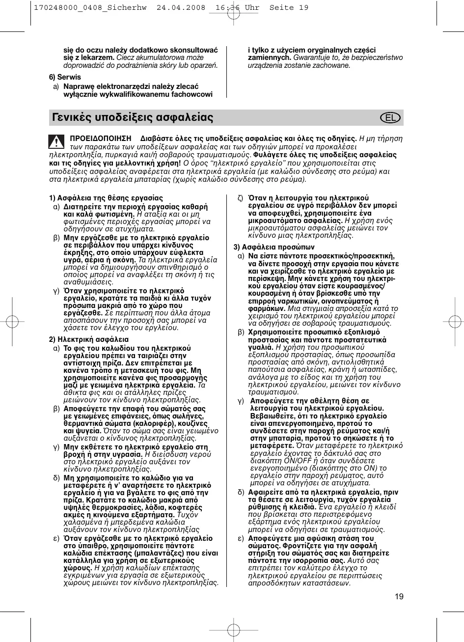 a) Naprawę elektronarzędzi należy zlecać wyłącznie wykwalifikowanemu fachowcowi Γενικές υποδείξεις ασφαλείας ΠΡΟΕΙΔΟΠΟΙΗΣΗ Διαβάστε λες τις υποδείξεις ασφαλείας και λες τις οδηγίες. Η μη τήρηση των παρακάτω των υποδείξεων ασφαλείας και των οδηγιών μπορεί να προκαλέσει ηλεκτροπληξία, πυρκαγιά και/ή σοβαρούς τραυματισμούς. Φυλάγετε λες τις υποδείξεις ασφαλείας και τις οδηγίες για μελλοντική χρήση! Ο ρος “ηλεκτρικ εργαλείο” που χρησιμοποιείται στις υποδείξεις ασφαλείας αναφέρεται στα ηλεκτρικά εργαλεία (με καλώδιο σύνδεσης στο ρεύμα) και στα ηλεκτρικά εργαλεία μπαταρίας (χωρίς καλώδιο σύνδεσης στο ρεύμα).