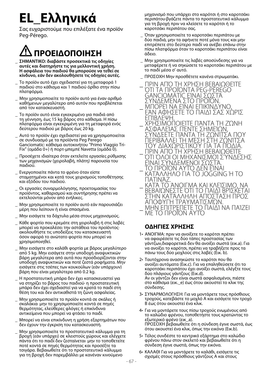_ Ne pas utiliser lorsque le nombre d’occupants est supérieur aux prescriptions du fabricant. _ Cet article est homologué pour des enfants dans le siège de la naissance jusqu’à un poids de 15 kg. Le marchepied arrière est homologué pour transporter un second enfant dont le poids n’excède pas 20 kg. _ Cet article a été conçu pour être utilisé en combinaison avec les produits Peg Perego Ganciomatic: Siège auto "Primo Viaggio Tri-Fix" (groupe 0+) ou Navetta (groupe 0). _ Prêter attention à la position de l’enfant lors des opérations de réglage des éléments mobiles (poignée, dossier). _ Toujours actionner le frein lorsque l’article est à l’arrêt et pendant l’installation ou la sortie de l’enfant. _ Les opérations d’assemblage, de préparation de l’article, de nettoyage et d’entretien doivent être réalisées uniquement par des adultes. _ Ne pas utiliser cet article si des pièces sont manquantes ou cassées. _ Éviter de mettre les doigts dans les mécanismes. _ Toute charge suspendue aux poignées peut déstabiliser le produit, suivre les recommandations du fabrication sur les charges maximales admises. _ Ne pas utiliser le panier pour transporter des charges dont le poids dépasse 5 kg. Ne pas introduire dans le porte-boisson des charges supérieures à celles indiquées sur le porte-boisson lui-même et ne jamais introduire de boissons chaudes. Ne pas introduire dans les poches de la capote (lorsqu'elles sont présentes) des objets dont le poids dépasse 0.2 kg. _ La main courante n’a pas été conçue pour supporter le poids de l’enfant; elle n’a pas non plus été conçue pour maintenir l’enfant en position assise et ne remplace pas la sangle de sécurité. _ Ne pas utiliser l’article à proximité d’escaliers ou de marches; ne pas l’utiliser à proximité de sources de chaleur, de flammes directes ou d’objets dangereux se trouvant à la portée de l’enfant. _ L’utilisation d’accessoires n’ayant pas été approuvés par le fabricant peut se révéler dangereuse. _ Ne pas utiliser l’habillage pluie (lorsqu’il est présent sur l’article) dans des milieux clos et toujours contrôler que l’enfant n’ait pas trop chaud; ne jamais placer à proximité de sources de chaleur et prendre garde aux cigarettes. S’assurer que l’habillage pluie n’interfère avec aucun mécanisme en mouvement du châssis ou de la poussette; toujours retirer l’habillage pluie avant de refermer le châssis ou la poussette. _ Lorsque la poussette est utilisée avec deux enfants, ne jamais les laisser seuls et ne pas laisser le second enfant monter sur le marchepied arrière tandis que la poussette est vide.