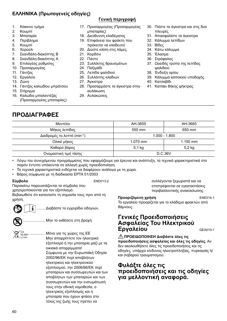 Déclaration de conformité CE Les soussignés, Tamiro Kishima et Rainer Bergfeld, tels qu’autorisés par Dolmar GmbH, déclarent que les outils DOLMAR : Nom de la machine : Taille-haie sans fil N° de modèle/Type : AH-3655, AH-3665 Spécifications : voir le tableau «SPÉCIFICATIONS ». sont fabriquées en série et sont conformes aux directives européennes suivantes : 2000/14/CE, 2006/42/CE et sont produites conformément aux normes ou documents de normalisation suivants : EN60745 La documentation technique se trouve dans les locaux de l'entreprise sise : Dolmar GmbH, Jenfelder Strañe 38, Abteilung FZ, en