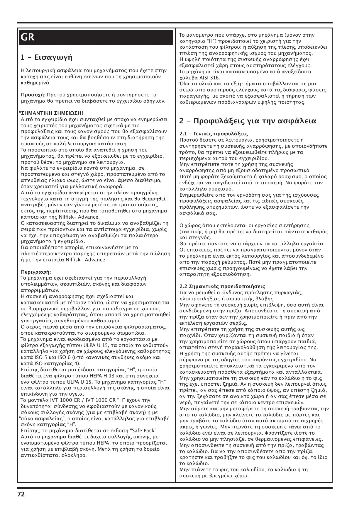 GR 1 - Εισαγωγή Η λειτουργική ασφάλεια του μηχανήματος που έχετε στην κατοχή σας είναι ευθύνη εκείνων που τη χρησιμοποιούν καθημερινά. Προσοχή: Προτού χρησιμοποιήσετε ή συντηρήσετε το μηχάνημα θα πρέπει να διαβάσετε το εγχειρίδιο οδηγιών. “ΣΗΜΑΝΤΙΚΗ ΣΗΜΕΙΩΣΗ! Αυτό το εγχειρίδιο έχει συνταχθεί με στόχο να ενημερώσει τους χειριστές του μηχανήματος σχετικά με τις προφυλάξεις και τους κανονισμούς που θα εξασφαλίσουν την ασφάλειά τους και θα βοηθήσουν στη διατήρηση της συσκευής σε καλή λειτουργική κατάσταση. Το προσωπικό στο οποίο θα ανατεθεί η χρήση του μηχανήματος, θα πρέπει να εξοικειωθεί με το εγχειρίδιο, προτού θέσει το μηχάνημα σε λειτουργία. Να φυλάτε το εγχειρίδιο κοντά στο μηχάνημα, σε προστατευμένο και στεγνό χώρο, προστατευμένο από το απευθείας ηλιακό φως, ώστε να είναι άμεσα διαθέσιμο, όταν χρειαστεί για μελλοντική αναφορά. Αυτό το εγχειρίδιο αναφέρεται στην πλέον προηγμένη τεχνολογία κατά τη στιγμή της πώλησης και θα θεωρηθεί ανακριβές μόνον εάν γίνουν μετέπειτα τροποποιήσεις, εκτός της περίπτωσης που θα τοποθετηθεί στο μηχάνημα κάποιο κιτ της Nilfisk- Advance. Ο κατασκευαστής διατηρεί το δικαίωμα να αναβαθμίζει τη σειρά των προϊόντων και τα αντίστοιχα εγχειρίδια, χωρίς να έχει την υποχρέωση να αναβαθμίζει τα παλαιότερα μηχανήματα ή εγχειρίδια. Για οποιαδήποτε απορία, επικοινωνήστε με το πλησιέστερο κέντρο παροχής υπηρεσιών μετά την πώληση ή με την εταιρεία Nilfisk- Advance. Περιγραφή: Το μηχάνημα έχει σχεδιαστεί για την περισυλλογή υπολειμμάτων, σκουπιδιών, σκόνης και διαφόρων απορριμμάτων. Η συσκευή αναρρόφησης έχει σχεδιαστεί και κατασκευαστεί με τέτοιον τρόπο, ώστε να χρησιμοποιείται σε βιομηχανικό περιβάλλον, για παράδειγμα σε χώρους ελεγχόμενης καθαρότητας, όπου μπορεί να χρησιμοποιηθεί για εργασίες συνηθισμένου καθαρισμού. Ο αέρας περνά μέσα από την επιφάνεια φιλτραρίσματος, όπου κατακρατούνται τα αιωρούμενα σωματίδια. Το μηχάνημα είναι εφοδιασμένο από το εργοστάσιο με φίλτρα εξαγωγής τύπου ULPA U 15, τα οποία το καθιστούν κατάλληλο για χρήση σε χώρους ελεγχόμενης καθαρότητας κατά ISO 5 και ISO 6 (υπό κανονικές συνθήκες ακόμα και κατά ISO κατηγορίας 4). Επίσης διατίθεται μια έκδοση κατηγορίας “H”, η οποία διαθέτει ένα φίλτρο τύπου HEPA H 13 και στη συνέχεια ένα φίλτρο τύπου ULPA U 15. Το μηχάνημα κατηγορίας “H” είναι κατάλληλο για περισυλλογή της σκόνης η οποία είναι επικίνδυνη για την υγεία. Τα μοντέλα IVT 1000 CR / IVT 1000 CR “H” έχουν τηv δυνατότητα σύνδεσης να εφοδιαστούν με κανονικούς σάκους συλλογής σκόνης (για μη επιβλαβή σκόνη) ή με “σάκο ασφαλείας”, ο οποίος είναι κατάλληλος για επιβλαβή σκόνη κατηγορίας “H”. Επίσης, το μηχάνημα διατίθεται σε έκδοση “Safe Pack”. Αυτό το μηχάνημα διαθέτει δοχείο συλλογής σκόνης με ενσωματωμένο φίλτρο τύπου HEPA, το οποίο προορίζεται για χρήση με επιβλαβή σκόνη. Μετά τη χρήση το δοχείο αντικαθίσταται ολόκληρο.