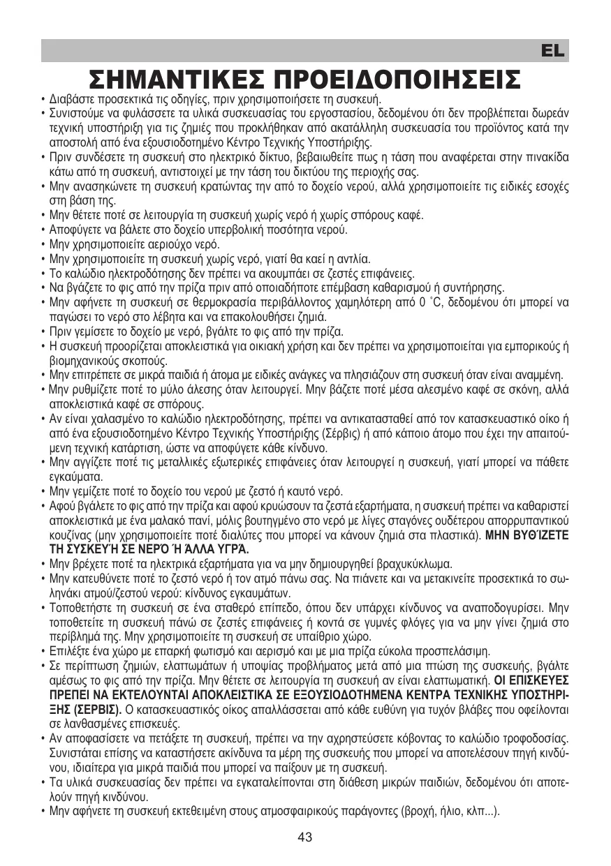 - Σε περίπτωση ζημιών, ελαττωμάτων ή υποψίας προβλήματος μετά από μια πτώση της συσκευής, βγάλτε αμέσως το φις από την πρίζα. Μην θέτετε σε λειτουργία τη συσκευή αν είναι ελαττωματική. ΟΙ ΕΠΙΣΚΕΥΕΣ ΠΡΕΠΕΙ ΝΑ ΕΚΤΕΛΟΥΝΤΑΙ ΑΠΟΚΛΕΙΣΤΙΚΑ ΣΕ ΕΞΟΥΣΙΟΔΟΤΗΜΕΝΑ ΚΕΝΤΡΑ ΤΕΧΝΙΚΗΣ ΥΠΟΣΤΗΡΙΞΗΣ (ΣΕΡΒΙΣ). Ο κατασκευαστικός οίκος απαλλάσσεται από κάθε ευθύνη για τυχόν βλάβες που οφείλονται σε λανθασμένες επισκευές.