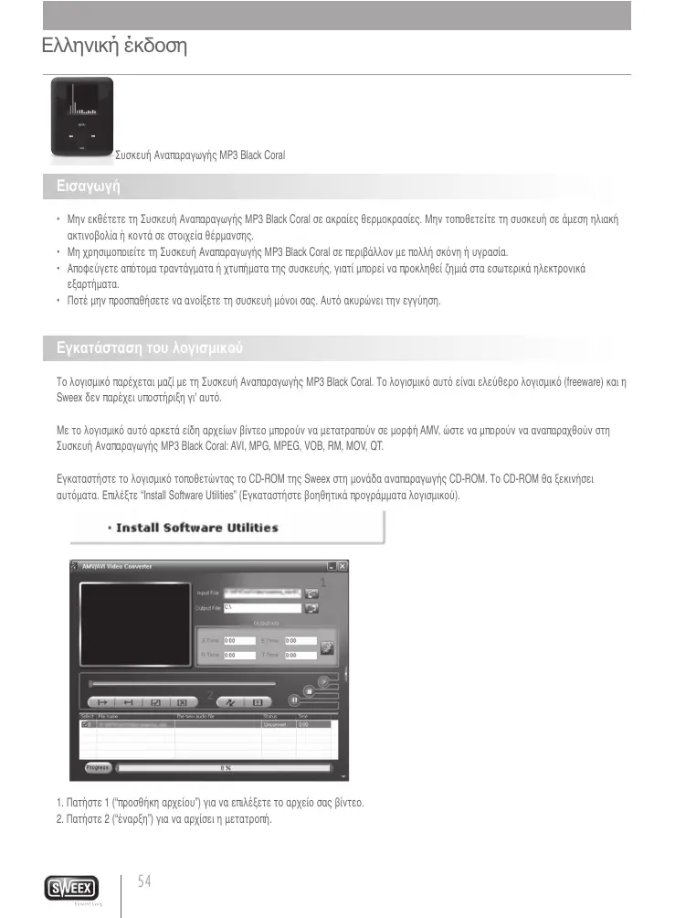 - Ποτέ μην προσπαθήσετε να ανοίξετε τη συσκευή μόνοι σας. Αυτό ακυρώνει την εγγύηση. Εγκατάσταση του λογισμικού Το λογισμικό παρέχεται μαζί με τη Συσκευή Αναπαραγωγής ΜΡ3 Black Coral. Το λογισμικό αυτό είναι ελεύθερο λογισμικό (freeware) και η Sweex δεν παρέχει υποστήριξη γι' αυτό. Με το λογισμικό αυτό αρκετά είδη αρχείων βίντεο μπορούν να μετατραπούν σε μορφή AMV, ώστε να μπορούν να αναπαραχθούν στη Συσκευή Αναπαραγωγής ΜΡ3 Black Coral: AVI, MPG, MPEG, VOB, RM, MOV, QT. Εγκαταστήστε το λογισμικό τοποθετώντας το CD-ROM της Sweex στη μονάδα αναπαραγωγής CD-ROM. Το CD-ROM θα ξεκινήσει αυτόματα. Επιλέξτε “Install Software Utilities” (Εγκαταστήστε βοηθητικά προγράμματα λογισμικού).