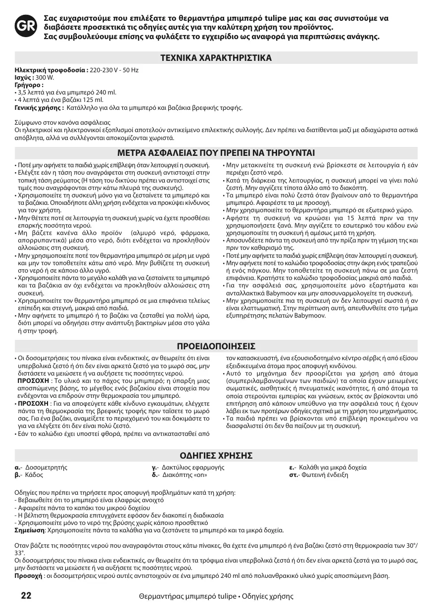 • Ne laissez pas votre enfant sans surveillance pendant le fonctionnement de l’appareil. • Vérifiez que la tension de votre installation électrique soit compatible avec l’appareil (voir valeurs indiquées sous l’appareil). • Utilisez l’appareil uniquement pour chauffer les biberons et petits pots. Tout autre utilisation pourrait s’avérer dangereuse. • Ne mettez jamais l’appareil sous tension avant d’y avoir versé une quantité d’eau suffisante. • N’ajoutez aucun autre produit (eau salée, médicaments, détergents) à l’eau car cela abîmerait l’appareil. • N’utilisez pas le chauffe-biberon dans des conditions humides et ne le placez pas directement sous l’eau. Ne plongez jamais l’appareil dans l’eau ni dans aucun autre liquide. • Ne laissez pas l’appareil près des sources de chaleur comme radiateurs, fenêtres ensoleillées… • Utilisez le chauffe-biberon sur une surface totalement plane et sèche, hors de portée des enfants. • N’utilisez pas le chauffe-biberon à l’extérieur. • Toujours utilisez les paniers pour chauffer les biberons et petits pots pour éviter d’endommager l’appareil. • Ne laissez pas le biberon ou le petit pot chauffer trop longtemps,