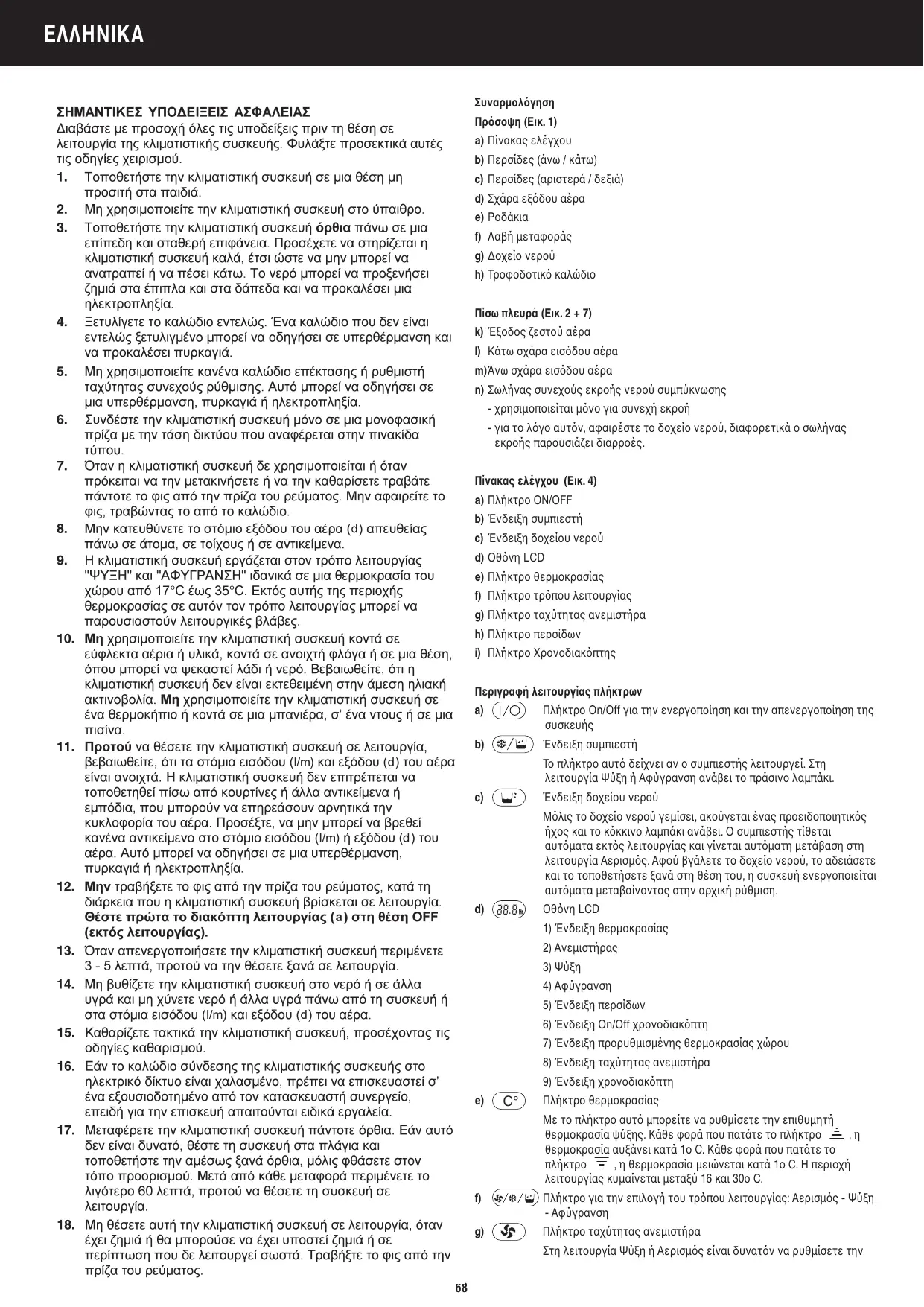 EΛΛHNIKA Συναρμολγηση Πρσοψη (Εικ. 1) a) Πίνακας ελέγχου b) Περσίδες (άνω / κάτω) c) Περσίδες (αριστερά / δεξιά) d) Σχάρα εξδου αέρα e) Ροδάκια f) Λαβή μεταφοράς g) Δοχείο νερού h) Τροφοδοτικ καλώδιο Πίσω πλευρά (Εικ. 2 + 7) k) Έξοδος ζεστού αέρα l) Κάτω σχάρα εισδου αέρα m)Άνω σχάρα εισδου αέρα n) Σωλήνας συνεχούς εκροής νερού συμπύκνωσης - χρησιμοποιείται μνο για συνεχή εκροή - για το λγο αυτν, αφαιρέστε το δοχείο νερού, διαφορετικά ο σωλήνας εκροής παρουσιάζει διαρροές. Πίνακας ελέγχου (Εικ. 4) a) Πλήκτρο ΟΝ/OFF b) Ένδειξη συμπιεστή c) Ένδειξη δοχείου νερού d) Οθνη LCD e) Πλήκτρο θερμοκρασίας f) Πλήκτρο τρπου λειτουργίας g) Πλήκτρο ταχύτητας ανεμιστήρα h) Πλήκτρο περσίδων