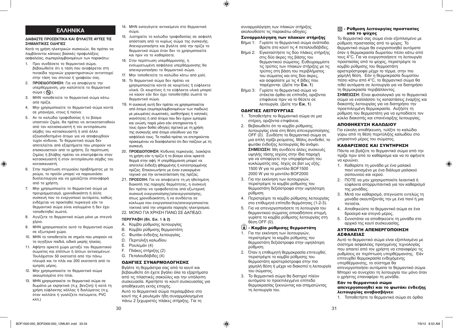 ΕKKΗΝΙΚΑ ΔΙΑΒΑΣΤΕ ΠΡΟΣΕΚΤΙΚΑ ΚΑΙ ΦΥΛΑΞΤΕ ΑΥΤΕΣ ΤΙΣ ΣΗΜΑΝΤΙΚΕΣ ΟΔΗΓΙΕΣ Κατά τη χρήση ηλεκτρικών συσκευών, θα πρέπει να λαμβάνονται κάποιες βασικές προφυλάξεις ασφαλείας, συμπεριλαμβανομένων των παρακάτω: 1. Πριν συνδέσετε το θερμαντικό σώμα, βεβαιωθείτε ότι η τάση που αναφέρεται στη πινακίδα τεχνικών χαρακτηριστικών αντιστοιχεί στην τάση του σπιτιού ή γραφείου σας. 2. ΠΡΟΕΙΔΟΠΟΙΗΣΗ: Για να αποφύγετε την υπερθέρμανση, μην καλύπτετε το θερμαντικό σώμα ( ). 3. ΜΗΝ τοποθετείτε το θερμαντικό σώμα κάτω από πρίζα. 4. Μην χρησιμοποιείτε το θερμαντικό σώμα κοντά σε μπανιέρα, ντους ή πισίνα. 5. Αν το καλώδιο τροφοδοσίας ή το βύσμα υποστούν ζημία, θα πρέπει να αντικατασταθούν από τον κατασκευαστή ή τον αντιπρόσωπο σέρβις του κατασκευαστή ή από άλλο εξουσιοδοτημένο άτομο για να αποφευχθούν τυχόν κίνδυνοι. Το θερμαντικό σώμα δεν αποτελείται από εξαρτήματα που μπορούν να επισκευαστούν από το χρήστη. Σε περίπτωση ζημίας ή βλάβης πρέπει να επιστρέφεται στον κατασκευαστή ή στον αντιπρόσωπο σέρβις του κατασκευαστή. 6. Στην περίπτωση στιγμιαίου προβλήματος με το ρεύμα, το προϊόν μπορεί να παρουσιάσει δυσλειτουργία και να χρειάζεται επαναφορά από το χρήστη. 7. Μην χρησιμοποιείτε το θερμαντικό σώμα με προγραμματισμό, χρονοδιακόπτη ή άλλη συσκευή που το ενεργοποιεί αυτόματα, καθώς ενδέχεται να προκληθεί πυρκαγιά εάν το θερμαντικό σώμα είναι καλυμμένο ή δεν έχει τοποθετηθεί σωστά. 8. Αγγίζετε το θερμαντικό σώμα μόνο με στεγνά χέρια. 9. ΜΗΝ χρησιμοποιείτε αυτό το θερμαντικό σώμα σε εξωτερικό χώρο. 10. ΜΗΝ το τοποθετείτε σε σημεία που μπορούν να το αγγίξουν παιδιά, ειδικά μικρής ηλικίας. 11. Αφήστε αρκετό χώρο μεταξύ του θερμαντικού σώματος και επίπλων ή άλλων αντικειμένων: Τουλάχιστον 50 εκατοστά από την πάνω πλευρά και το πλάι και 200 εκατοστά από το εμπρός μέρος. 12. Μην χρησιμοποιείτε το θερμαντικό σώμα ακουμπισμένο στο πλάι. 13. ΜΗΝ χρησιμοποιείτε το θερμαντικό σώμα σε δωμάτια με εκρηκτικά (π.χ. βενζίνη) ή κατά τη χρήση εύφλεκτης κόλλας ή διαλύματος (π.χ. όταν κολλάτε ή γυαλίζετε πατώματα, PVC κλπ.)