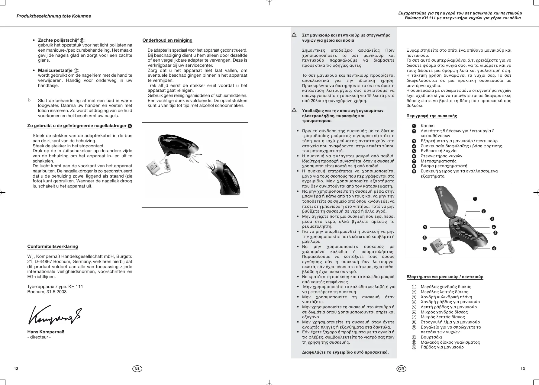∆λωση συµφωνας Εµες, η εταιρα Kompernaß Handelsgesellschaft mbH, Burgstr. 21, D-44867 Bochum, Γερµανα, δηλ(νουµε µε την παρο σα !τι το προϊ!ν αυτ! ανταποκρνεται σε !λες τις εφαρµοστες διεθνες προδιαγραφς, στις διατξεις και τους κανονισµο ς Τ πος συσκευς: ΚΗ 111 Bochum, 31.5.2003 Hans Kompernaß - ∆ιευθυντς -