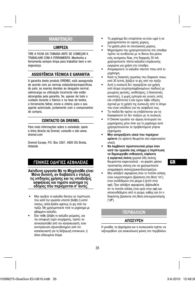 Μην αγγίξετε το καλώδιο δικτύου σε περίπτωση που κατά την εργασία υποστεί βλάβη ή κοπεί τελείως, αλλά βγάλτε αμέσως το φις από την πρίζα. Μη χρησιμοποιείτε ποτέ το μηχάνημα με φθαρμένο καλώδιο. Εάν πάθει βλάβη το καλώδιο ρεύματος, για την αποφυγή τυχόν ατυχήματος, πρέπει να αντικατασταθεί από τον κατασκευαστή, έναν αντιπρόσωπο εξουσιοδοτημένο από τον κατασκευαστή για τη διεξαγωγή επισκευών, ή άλλα ειδικευμένα άτομα. 10399275-GlueGun-EU-0610.indb 35 Το μηχάνημα δεν επιτρέπεται να είναι υγρό ή να χρησιμοποιείται σε υγρούς χώρους. Για χρήση μόνο σε εσωτερικούς χώρους. Μηχανήματα που χρησιμοποιούνται στο ύπαιθρο πρέπει να συνδέονται με το δίκτυο δια μέσου ενός αυτόματου διακ_πτη διαρροής 30 mA. χρησιμοποιείτε πάντα καλώδια επιμήκυνσης εγκριμένα για χρήση στο ύπαιθρο. Απομακρύνετε το καλώδιο πάντοτε πίσω από το Κατά τις διακοπές εργασίας που διαρκούν πανω από 30 λεπτά, βγάζετε το φις από την πρίζα. Αυτή η συσκευή δεν προορίζεται για χρήση από άτομα (συμπεριλαμβανομένων παιδιών) με μειωμένες φυσικές, αισθητήριες, ή διανοητικές ικανότητες, ή χωρίς εμπειρία και γνώση, εκτός εάν επιβλέπονται ή εάν έχουν λάβει οδηγίες σχετικά με τη χρήση της συσκευής από το άτομο που είναι υπεύθυνο για την ασφάλειά τους. Τα παιδιά θα πρέπει να επιβλέπονται για να διασφαλιστεί ότι δεν παίζουν με τη συσκευή. Η Dremel εγγυάται την άψογη λειτουργία του μηχανήματος μόνο όταν για το μηχάνημα αυτό χρησιμοποιούνται τα προβλεπόμενα γνήσια εξαρτήματα. Μην κατεργάζεστε υλικά που περιέχουν αμίαντο (το αμίαντο θεωρείται σαν καρκινογόνο Να λαμβάνετε προστατευτικά μέτρα όταν κατά την εργασία σας υπάρχει η περίπτωση να δημιουργηθει ανθυγιεινή, εύφλεκτη ή εκρηκτική σκόνη (μερικά είδη σκόνης θεωρούνται καρκινογόνα) - να φοράτε μάσκα προστασίας σκόνης και να χρησιμοποιείτε αναρρόφηση σκόνης/ροκανιδιών/γρεζιών. Μην αλλάζετε ακροφύσια όταν το πιστόλι κόλλας είναι ενεργοποιημένο (βρίσκεται στη θέση “on”), είναι συνδεδεμένο στο ρεύμα ή ζεστό στην αφή. Πριν αλλάξετε ακροφύσια, βεβαιωθείτε ότι το πιστόλι κόλλας είναι κρύο στην αφή και αποσυνδεδεμένο από το ρεύμα, καθώς και ότι ο διακόπτης βρίσκεται στη θέση απενεργοποίησης (“off”).