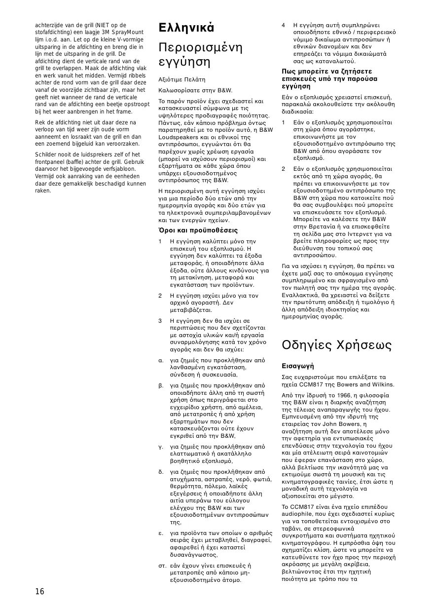 Ελληνικά Περιορισµένη εγγύηση Αξιτιµε Πελάτη Καλωσορίσατε στην B&W. Το παρν προϊν έχει σχεδιαστεί και κατασκευαστεί σύµφωνα µε τις υψηλτερες προδιαγραφές ποιτητας. Πάντως, εάν κάποιο πρβληµα ντως παρατηρηθεί µε το προϊν αυτ, η B&W Loudspeakers και οι εθνικοί της αντιπρσωποι, εγγυώνται τι θα παρέχουν χωρίς χρέωση εργασία (µπορεί να ισχύσουν περιορισµοί) και εξαρτήµατα σε κάθε χώρα που υπάρχει εξουσιοδοτηµένος αντιπρσωπος της B&W. Η περιορισµένη αυτή εγγύηση ισχύει για µια περίοδο δύο ετών απ την ηµεροµηνία αγοράς και δύο ετών για τα ηλεκτρονικά συµπεριλαµβανοµένων και των ενεργών ηχείων.