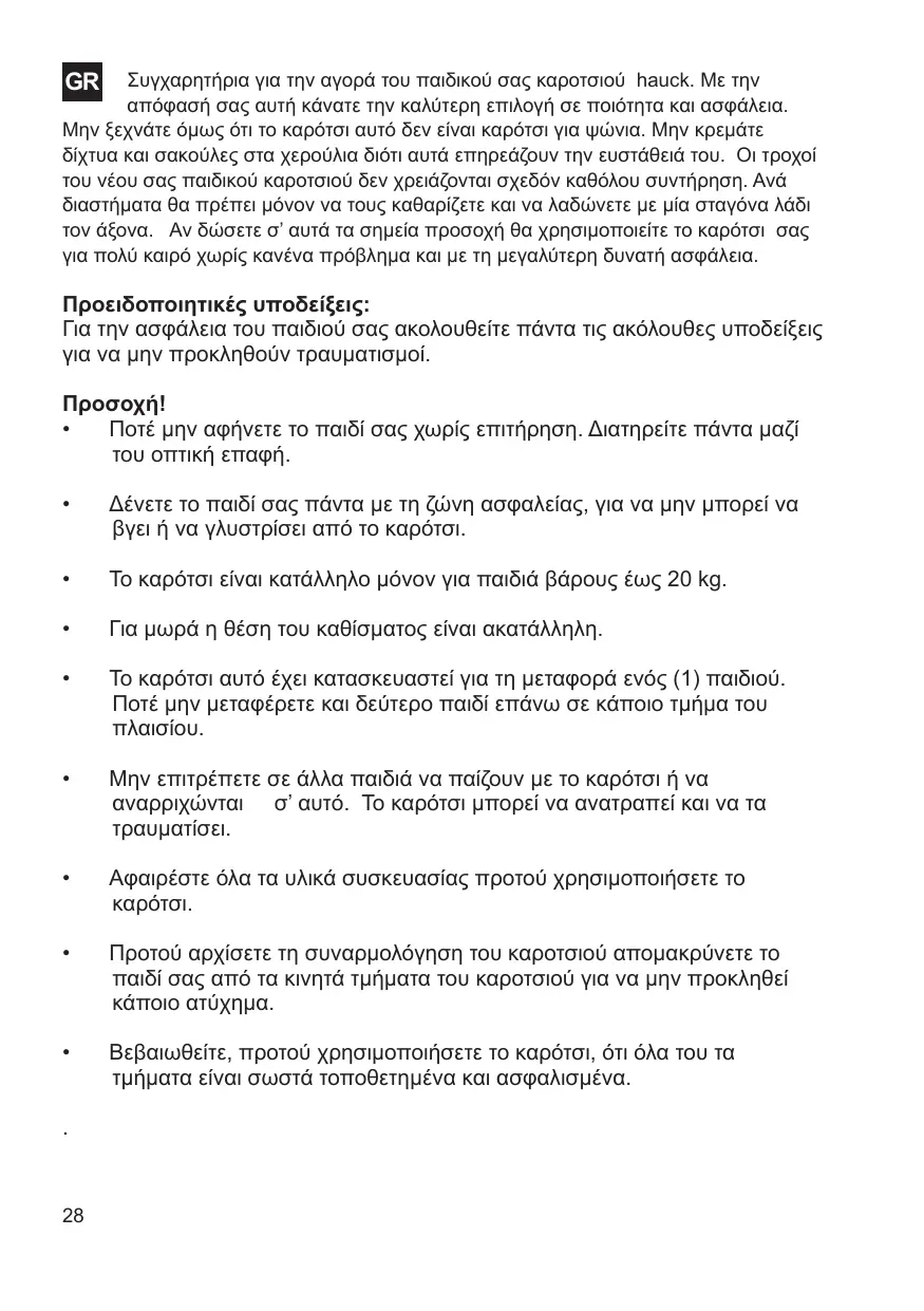 Προειδοποιητική υπόδειξη Σύμφωνα με το DIN 66068 πρέπει να σας επιστήσουμε την προσοχή στο ότι δεν επιτρέπεται να αναρτώνται δίχτυα, τσάντες κ.α. στο χερούλι του καροτσιού επειδή αυτό εύκολα ανατρέπεται. Σε καρότσια με περιστρεφόμενα χερούλια πρέπει να προσέχετε: Όταν ανεβαίνετε την σκάλα κρατάτε το καρότσι από το πλαίσιο - ποτέ από το χερούλι! Παρακαλώ χρησιμοποιείτε μόνο τα αρχικά εξαρτήματα hauck και τα αρχικά ανταλλακτικά hauck.