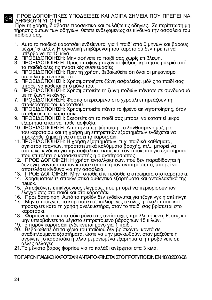 Πριν τη χρήση, διαβάστε προσεκτικά και φυλάξτε τις οδηγίες. Σε περίπτωση μη τήρησης αυτών των οδηγιών, θέτετε ενδεχομένως σε κίνδυνο την ασφάλεια του παιδιού σας. 1. Αυτό το παιδικό καροτσάκι ενδείκνυται για 1 παιδί από 0 μηνών και βάρους μέχρι 15 κιλών. Η συνολική επιβάρυνση του καροτσιού δεν πρέπει να υπερβαίνει τα 15 κιλά. 2. ΠΡΟΕΙΔΟΠΟΙΗΣΗ: Μην αφήνετε το παιδί σας χωρίς επίβλεψη. 3. ΠΡΟΕΙΔΟΠΟΙΗΣΗ: Προς αποφυγή τυχόν ασφυξίας, κρατήστε μακριά από τα παιδιά όλες τις πλαστικές συσκευασίες. 4. ΠΡΟΕΙΔΟΠΟΙΗΣΗ: Πριν τη χρήση, βεβαιωθείτε ότι όλοι οι μηχανισμοί ασφάλισης είναι κλειστοί. 5. ΠΡΟΕΙΔΟΠΟΙΗΣΗ: Χρησιμοποιήστε ζώνη ασφαλείας, μόλις το παιδί σας μπορεί να κάθεται από μόνο του. 6. ΠΡΟΕΙΔΟΠΟΙΗΣΗ: Χρησιμοποιείτε τη ζώνη ποδιών πάντοτε σε συνδυασμό με τη ζώνη λεκάνης. 7. ΠΡΟΕΙΔΟΠΟΙΗΣΗ: Φορτία στερεωμένα στο χερούλι επηρεάζουν τη σταθερότητα του καροτσιού. 8. ΠΡΟΕΙΔΟΠΟΙΗΣΗ: Χρησιμοποιείτε πάντα το φρένο ακινητοποίησης, όταν σταθμεύετε το καροτσάκι. 9. ΠΡΟΕΙΔΟΠΟΙΗΣΗ: Σκεφτείτε ότι το παιδί σας μπορεί να καταπιεί μικρά εξαρτήματα και να πάθει ασφυξία. 10.ΠΡΟΕΙΔΟΠΟΙΗΣΗ: Από την υπερφόρτωση, το λανθασμένο μάζεμα του καροτσιού και τη χρήση μη επιτρεπτών εξαρτημάτων ενδέχεται να προκληθεί ζημιά ή να σπάσει το καροτσάκι. 11.ΠΡΟΕΙΔΟΠΟΙΗΣΗ: Η χρήση εξαρτημάτων, π.χ. παιδικά καθίσματα, άγκιστρα τσαντών, προστατευτικά καλύμματα βροχής, κτλ., μπορεί να αποτελεί κίνδυνο για την ασφάλεια, εκτός και εάν πρόκειται για εξαρτήματα που επιτρέπει ο κατασκευαστής ή ο αντιπρόσωπος. 12. ΠΡΟΕΙΔΟΠΟΙΗΣΗ: Η χρήση ανταλλακτικών, που δεν παραδίδονται ή δεν εγκρίνονται από τον κατασκευαστή ή τον αντιπρόσωπο, μπορεί να αποτελέσει κίνδυνο για την ασφάλεια. 13. ΠΡΟΕΙΔΟΠΟΙΗΣΗ: Μην τοποθετείτε πρόσθετα στρώματα στο καροτσάκι. 14. Χρησιμοποιείτε αποκλειστικά αυθεντικά εξαρτήματα και ανταλλακτικά της hauck. 15. Αποφεύγετε επικίνδυνους ελιγμούς, που μπορεί να περιορίσουν τον έλεγχο σας στο παιδί και στο καροτσάκι. 16. Προειδοποίηση: Αυτό το προϊόν δεν ενδείκνυται για τζόγκινγκ ή σκέιτινγκ. 17. Μην σπρώχνετε το καροτσάκι σε κυλιόμενες σκάλες ή σκαλοπάτια και προσέχετε κατά τη χρήση ανελκυστήρα, όταν το παιδί σας βρίσκεται στο καροτσάκι. 18. Φορτώνετε το καροτσάκι μόνο στις αντίστοιχες προβλεπόμενες θέσεις και μην υπερβαίνετε το μέγιστο επιτρεπόμενο βάρος των 15 κιλών. 19.Το παρόν καροτσάκι ενδείκνυται μόνο για 1 παιδί. 20. Βεβαιωθείτε ότι τα χέρια του παιδιού δεν βρίσκονται κοντά σε αναδιπλούμενα εξαρτήματα, ώστε να μην μαγκωθούν, όταν μαζεύετε ή ανοίγετε το καροτσάκι ή άλλα μεμονωμένα εξαρτήματα ή προβαίνετε σε άλλες αλλαγές. 21.Το μέγιστο βάρος φορτίου για το καλάθι ανέρχεται στα 3 κιλά. ΤΟ ΠΑΡΟΝ ΠΑΙΔΙΚΟ ΚΑΡΟΤΣΑΚΙ ΑΝΤΑΠΟΚΡΙΝΕΤΑΙ ΣΤΟ ΠΡΟΤΥΠΟ DIN EN 1888:2003-06.