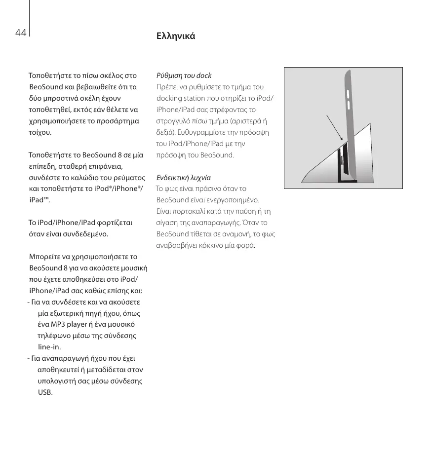 Τοποθετήστε το πίσω σκέλος στο BeoSound και βεβαιωθείτε ότι τα δύο μπροστινά σκέλη έχουν τοποθετηθεί, εκτός εάν θέλετε να χρησιμοποιήσετε το προσάρτημα τοίχου. Τοποθετήστε το BeoSound 8 σε μία επίπεδη, σταθερή επιφάνεια, συνδέστε το καλώδιο του ρεύματος και τοποθετήστε το iPod®/iPhone®/ iPad™. Το iPod/iPhone/iPad φορτίζεται όταν είναι συνδεδεμένο. Μπορείτε να χρησιμοποιήσετε το BeoSound 8 για να ακούσετε μουσική που έχετε αποθηκεύσει στο iPod/ iPhone/iPad σας καθώς επίσης και: - Για να συνδέσετε και να ακούσετε μία εξωτερική πηγή ήχου, όπως ένα MP3 player ή ένα μουσικό τηλέφωνο μέσω της σύνδεσης line-in. - Για αναπαραγωγή ήχου που έχει αποθηκευτεί ή μεταδίδεται στον υπολογιστή σας μέσω σύνδεσης USB.