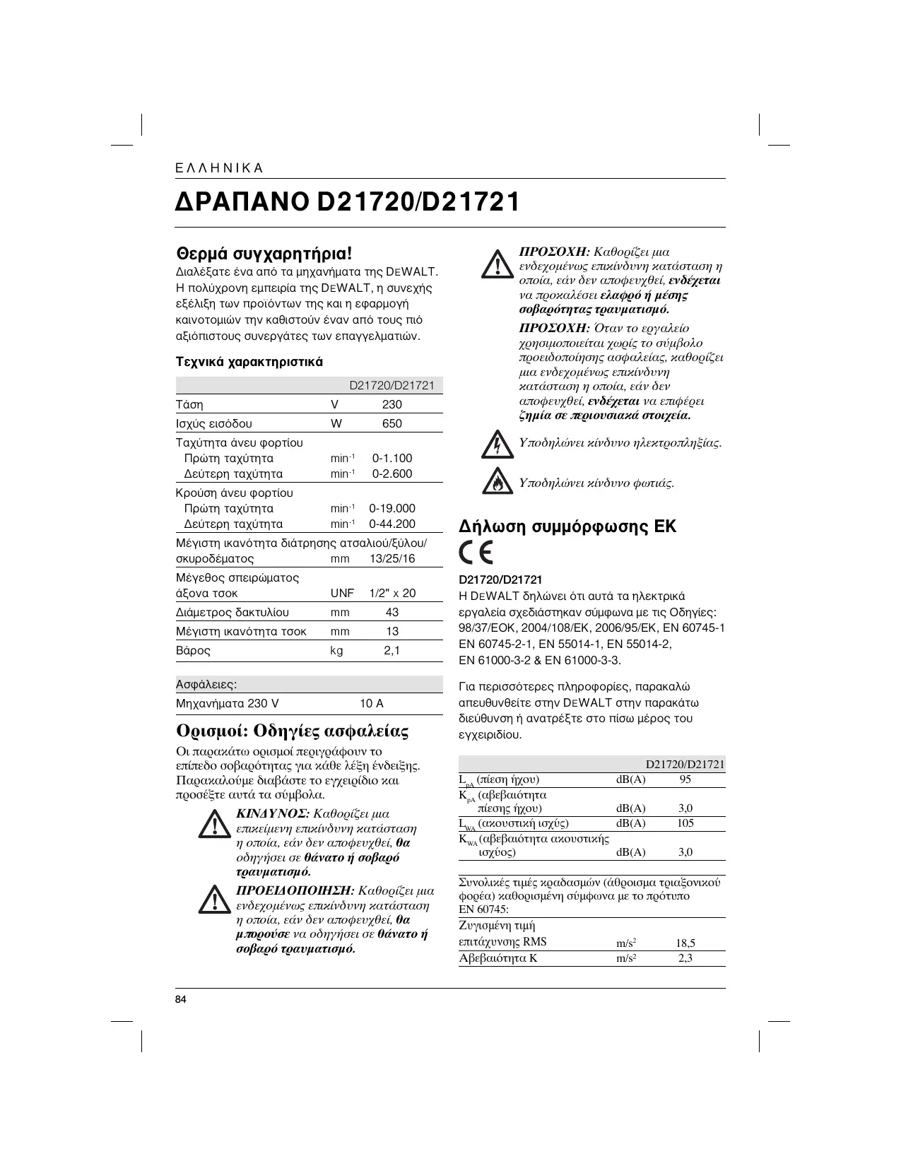dB(A) 3,0 Συνολικές τιμές κραδασμών (άθροισμα τριαξονικού φορέα) καθορισμένη σύμφωνα με το πρότυπο EN 60745: Ζυγισμένη τιμή επιτάχυνσης RMS Αβεβαιότητα K m/s2 m/s² 18,5 2,3 ∂§§∏¡I∫∞ Η καθορισμένη τιμή εκπομπής κραδασμών έχει μετρηθεί σύμφωνα με την τυπική μέθοδο δοκιμών και μπορεί να χρησιμοποιηθεί για τη σύγκριση των εργαλείων μεταξύ τους. Η καθορισμένη τιμή εκπομπής κραδασμών μπορεί επίσης να χρησιμοποιηθεί σε προκαταρκτική αποτίμηση έκθεσης. ΠΡΟΕΙΔΟΠΟΙΗΣΗ: Η τιμή εκπομπής κραδασμών κατά την πραγματική χρήση του εργαλείου μπορεί να διαφέρει από την καθορισμένη τιμή, ανάλογα με τους τρόπους χρήσης του εργαλείου. Αυτό θα μπορούσε να οδηγήσει σε σημαντική υποτίμηση της έκθεσης όταν το εργαλείο χρησιμοποιείται τακτικά μ’ αυτό τον τρόπο. Μια αποτίμηση του επιπέδου έκθεσης σε κραδασμούς που διαπιστώνονται κατά τη διάρκεια μιας δεδομένης περιόδου εργασίας, θα πρέπει επίσης να λαμβάνει υπόψη τα χρονικά διαστήματα παύσης λειτουργίας του εργαλείου και τα διαστήματα λειτουργίας σε ρελαντί, πλέον του χρόνου ενεργοποίησης. Αυτό μπορεί να μειώσει σημαντικά το επίπεδο έκθεσης κατά τη συνολική χρονική διάρκεια Διευθυντής του τμήματος Μηχανικής και Ανάπτυξης Προϊόντων Horst Grossmann DEWALT, Richard-Klinger-Strase 11, D-65510, Idstein, Almanya ΠΡΟΕΙΔΟΠΟΙΗΣΗ: Για μείωση του κινδύνου τραυματισμού, διαβάστε το εγχειρίδιο οδηγιών. Γενικές προειδοποιήσεις ασφαλείας ηλεκτρικού εργαλείου ΠΡΟΕΙΔΟΠΟΙΗΣΗ! Διαβάστε όλες τις προειδοποιήσεις ασφαλείας και όλες τις οδηγίες Εάν δεν τηρηθούν οι προειδοποιήσεις και οδηγίες, αυτό μπορεί να έχει ως αποτέλεσμα ηλεκτροπληξία, φωτιά ή/και σοβαρό τραυματισμό. ΦΥΛΑΞΤΕ ΟΛΕΣ ΤΙΣ ΠΡΟΕΙΔΟΠΟΙΗΣΕΙΣ ΚΑΙ ΟΔΗΓΙΕΣ ΓΙΑ ΜΕΛΛΟΝΤΙΚΗ Ο όρος “ηλεκτρικό εργαλείο” σε όλες τις προειδοποιήσεις, αναφέρεται σε εργαλείο ηλεκτροδοτούμενο (με καλώδιο) από την κύρια παροχή ηλεκτροδότησης, ή σε εργαλείο με ασύρματη δυνατότητα λειτουργίας (με