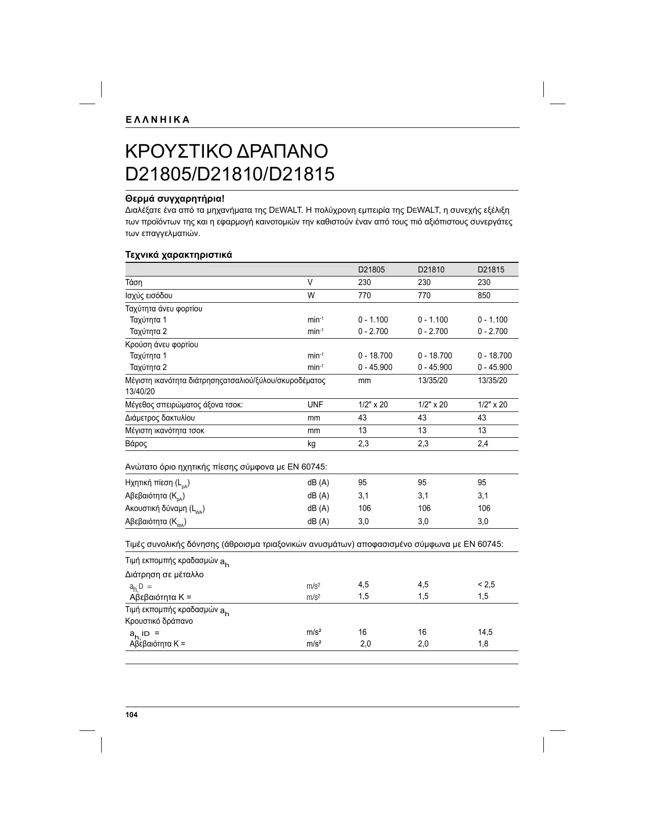 ΚΡΟΥΣΤΙΚΟ ΔΡΑΠΑΝΟ D21805/D21810/D21815 Θερμά συγχαρητήρια! Διαλέξατε ένα από τα μηχανήματα της DEWALT. Η πολύχρονη εμπειρία της DEWALT, η συνεχής εξέλιξη των προϊόντων της και η εφαρμογή καινοτομιών την καθιστούν έναν από τους πιό αξιόπιστους συνεργάτες των επαγγελματιών. Τεχνικά χαρακτηριστικά D21805 D21810 D21815