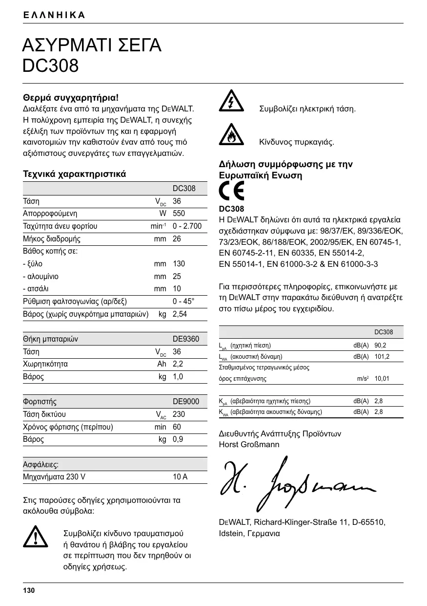 ΑΣΥΡΜΑΤΙ ΣΕΓΑ DC308 Θερμά συγχαρητήρια! Διαλέξατε ένα από τα μηχανήματα της DEWALT. Η πολύχρονη εμπειρία της DEWALT, η συνεχής εξέλιξη των προϊόντων της και η εφαρμογή καινοτομιών την καθιστούν έναν από τους πιό αξιόπιστους συνεργάτες των επαγγελματιών. DC308 VDC 36 Απορροφούμενη Ταχύτητα άνευ φορτίου Μήκος διαδρομής W 550 min-1 0 - 2.700 mm 26 Βάθος κοπής σε:
