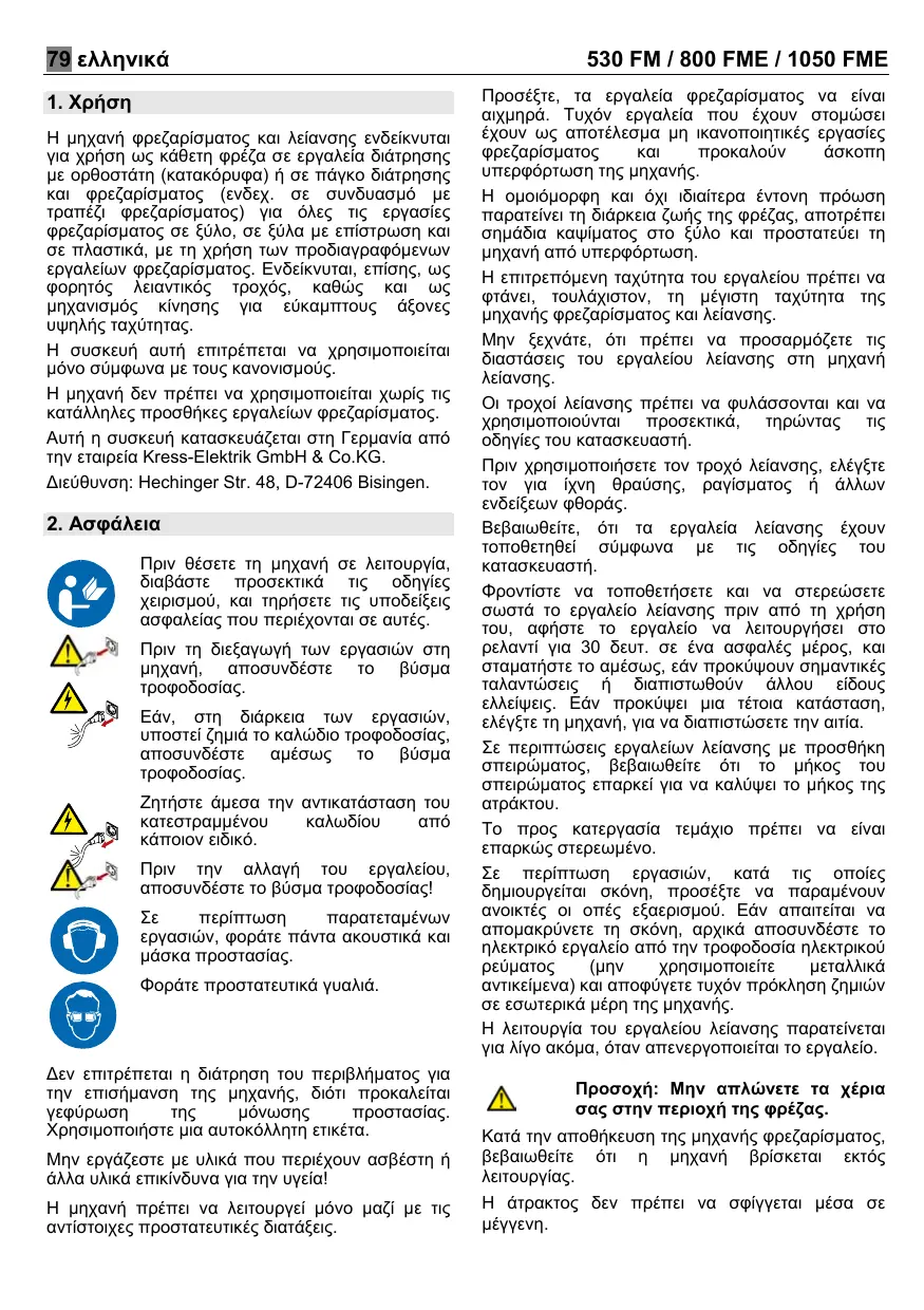 Η µηχανή φρεζαρίσµατος και λείανσης ενδείκνυται για χρήση ως κάθετη φρέζα σε εργαλεία διάτρησης µε ορθοστάτη (κατακόρυφα) ή σε πάγκο διάτρησης και φρεζαρίσµατος (ενδεχ. σε συνδυασµό µε τραπέζι φρεζαρίσµατος) για όλες τις εργασίες φρεζαρίσµατος σε ξύλο, σε ξύλα µε επίστρωση και σε πλαστικά, µε τη χρήση των προδιαγραφόµενων εργαλείων φρεζαρίσµατος. Ενδείκνυται, επίσης, ως φορητός λειαντικός τροχός, καθώς και ως µηχανισµός κίνησης για εύκαµπτους άξονες υψηλής ταχύτητας. Η συσκευή αυτή επιτρέπεται να χρησιµοποιείται µόνο σύµφωνα µε τους κανονισµούς. Η µηχανή δεν πρέπει να χρησιµοποιείται χωρίς τις κατάλληλες προσθήκες εργαλείων φρεζαρίσµατος. Αυτή η συσκευή κατασκευάζεται στη Γερµανία από την εταιρεία Kress-Elektrik GmbH & Co.KG. ∆ιεύθυνση: Hechinger Str. 48, D-72406 Bisingen.