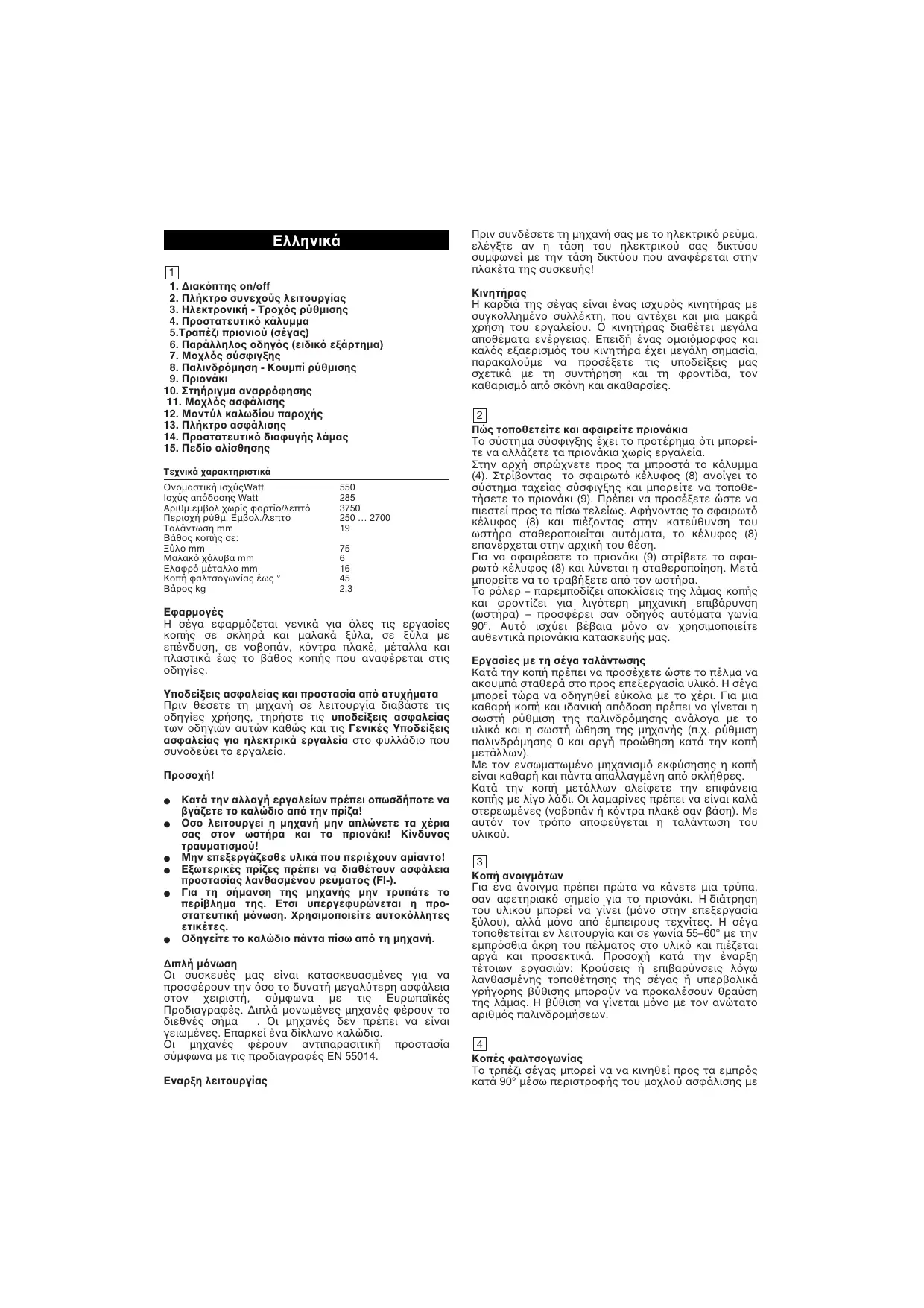 2,3 Eφαρµογέσ H σέγα εφαρµÞζεται γενικά για Þλεσ τισ εργασίεσ κοπήσ σε σκληρά και µαλακά ξύλα, σε ξύλα µε επένδυση, σε νοβοπάν, κÞντρα πλακέ, µέταλλα και πλαστικά έωσ το βάθοσ κοπήσ που αναφέρεται στισ Yποδείξεισ ασφαλείασ και προστασία απÞ ατυχήµατα Πριν θέσετε τη µηχανή σε λειτουργία διαβάστε τισ οδηγίεσ χρήσησ, τηρήστε τισ υποδείξεισ ασφαλείασ των οδηγιών αυτών καθώσ και τισ Γενικέσ Yποδείξεισ ασφαλείασ για ηλεκτρικά εργαλεία στο φυλλάδιο που συνοδεύει το εργαλείο.