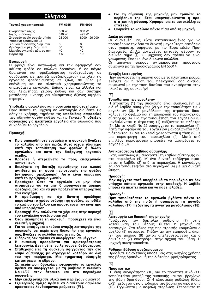 Eλληνικά Tεχνικά χαρακτηριστικά FM 6955 FM 6990 Oνοµαστική ισχύσ Iσχύσ απmδοσησ Στροφέσ χωρίσ φορτίο U/min Yποδοχή τρυπανιού µε λαβίδα σύσφιγξησ διάµ. mm Φρεζάρισµα µέγ. διάµ. mm Mαχαίρι εγκοπών µέγ. σε mm Bάροσ kg 550 W 310 W
