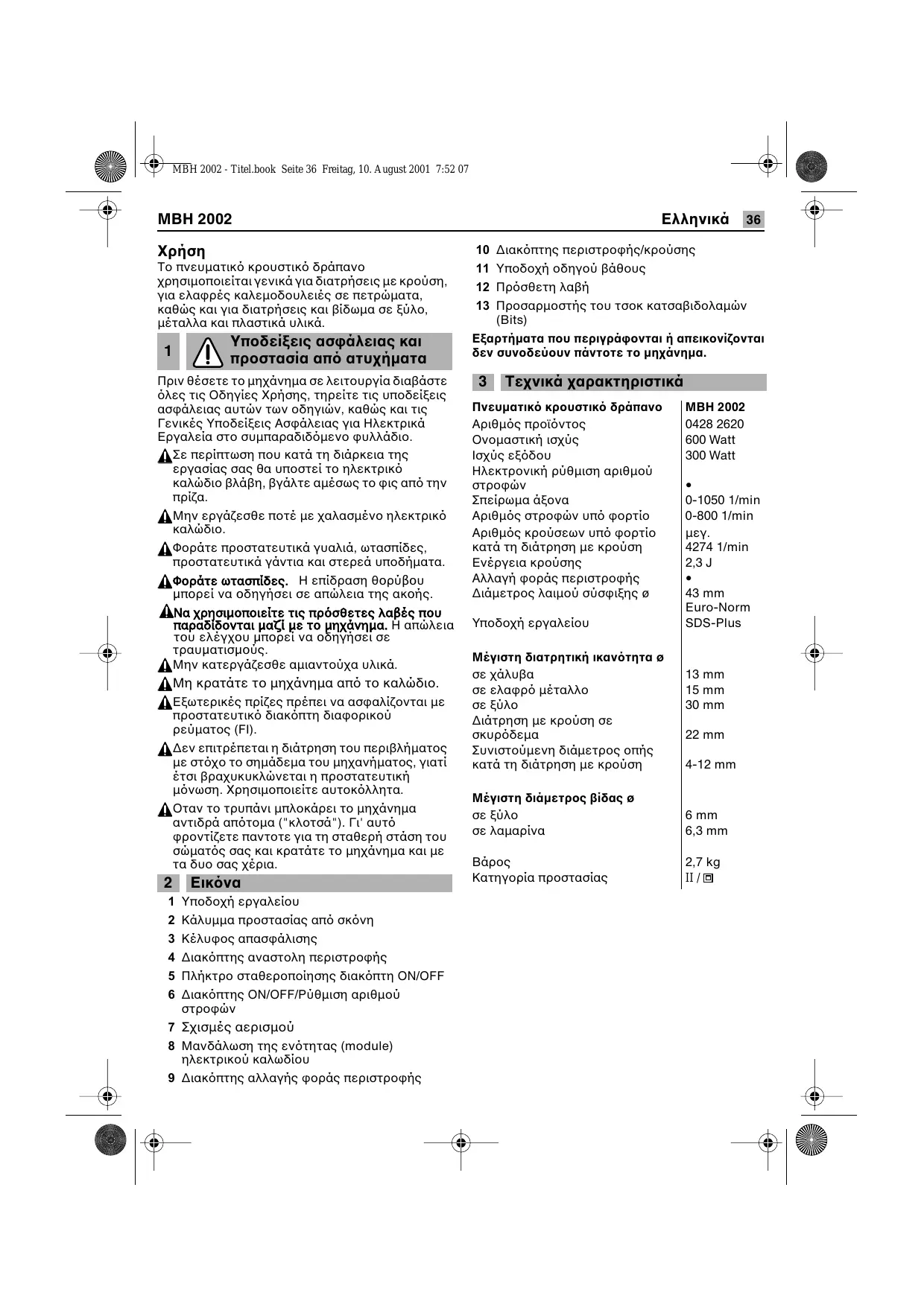 Τεχνικά χαρακτηριστικά Πνευµατικ( κρουστικ( δράπανο Αριθµ ς προϊ ντος Ονοµαστική ισχύς Ισχύς εξ δου Hλεκτρονική ρύθµιση αριθµού Σπείρωµα άξονα Αριθµ ς στροφών υπ φορτίο Αριθµ ς κρούσεων υπ φορτίο κατά τη διάτρηση µε κρούση Ενέργεια κρούσης Αλλαγή φοράς περιστροφής ∆ιάµετρος λαιµού σύσφιξης ø Υποδοχή εργαλείου MBH 2002 600 Watt 300 Watt