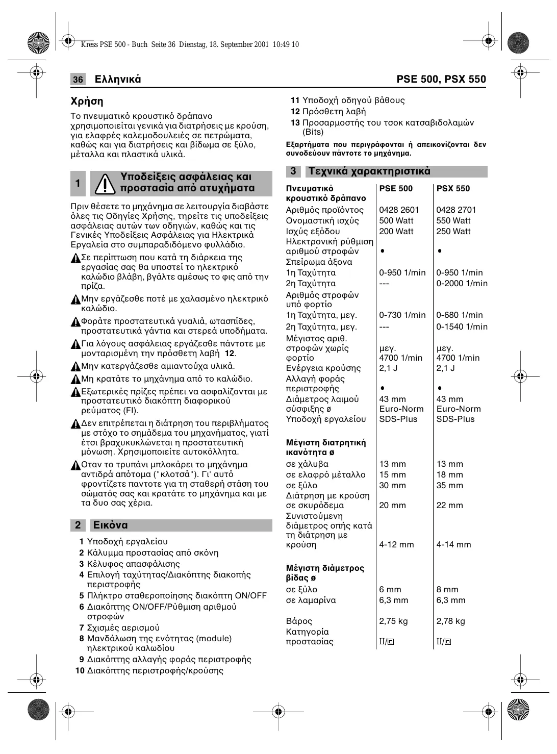 ΕικÞνα Υποδοχή εργαλείου Κάλυµµα προστασίασ απÞ σκÞνη Κέλυφοσ απασφάλισησ Επιλογή ταχύτητασ/∆ιακÞπτησ διακοπήσ περιστροφήσ 5 Πλήκτρο σταθεροποίησησ διακÞπτη ΟΝ/OFF 6 ∆ιακÞπτησ ΟΝ/OFF/Ρύθµιση αριθµού 7 Σχισµέσ αερισµού 8 Μανδάλωση τησ ενÞτητασ (module) ηλεκτρικού καλωδίου 9 ∆ιακÞπτησ αλλαγήσ φοράσ περιστροφήσ 10 ∆ιακÞπτησ περιστροφήσ/κρούσησ PSE 500, PSX 550 11 Υποδοχή οδηγού βάθουσ 12 ΠρÞσθετη λαβή 13 Προσαρµοστήσ του τσοκ κατσαβιδολαµών (Bits) Εξαρτήµατα που περιγράφονται ή απεικονίζονται δεν συνοδεύουν πάντοτε το µηχάνηµα.