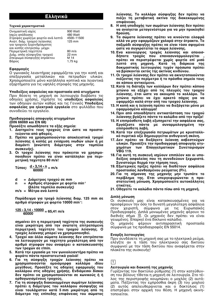 = ∆ιάµετρος τροχού σε mm = Aριθµ ς στροφών µε φορτίο min-1 (βλέπε ταµπέλα συσκευής) m/s = Mέτρα ανά λεπτ Παράδειγµα για τροχ λείανσης διαµ. 125 mm σε αριθµ στροφών µε φορτίο 10000 min-1: 125 3,14 10000 = 65,41 m/s