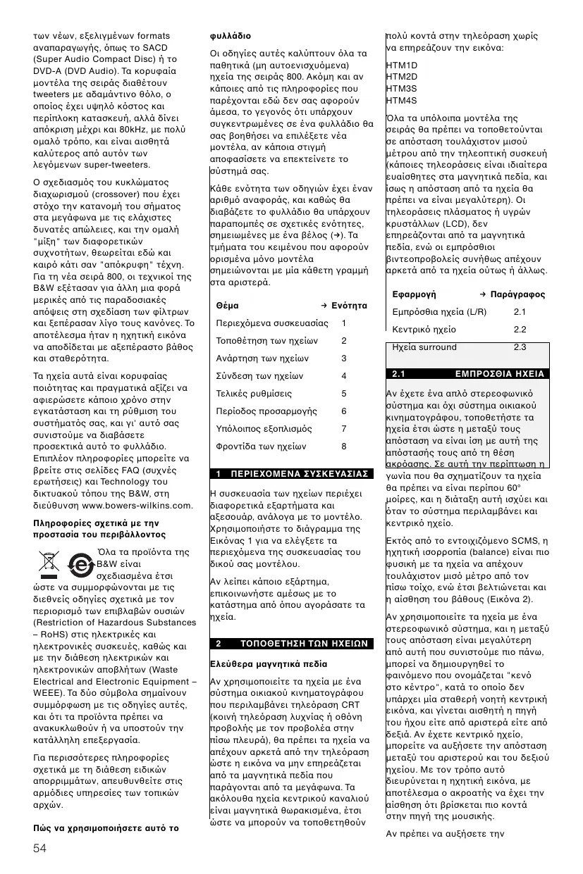 των νέων, εξελιγµένων formats αναπαραγωγήσ, Þπωσ το SACD (Super Audio Compact Disc) ή το DVD-A (DVD Audio). Τα κορυφαία µοντέλα τησ σειράσ διαθέτουν tweeters µε αδαµάντινο θÞλο, ο οποίοσ έχει υψηλÞ κÞστοσ και περίπλοκη κατασκευή, αλλά δίνει απÞκριση µέχρι και 80kHz, µε πολύ οµαλÞ τρÞπο, και είναι αισθητά καλύτεροσ απÞ αυτÞν των λεγÞµενων super-tweeters. Ο σχεδιασµÞσ του κυκλώµατοσ διαχωρισµού (crossover) που έχει στÞχο την κατανοµή του σήµατοσ στα µεγάφωνα µε τισ ελάχιστεσ δυνατέσ απώλειεσ, και την οµαλή "µίξη" των διαφορετικών συχνοτήτων, θεωρείται εδώ και καιρÞ κάτι σαν "απÞκρυφη" τέχνη. Για τη νέα σειρά 800, οι τεχνικοί τησ B&W εξέτασαν για άλλη µια φορά µερικέσ απÞ τισ παραδοσιακέσ απÞψεισ στη σχεδίαση των φίλτρων και ξεπέρασαν λίγο τουσ κανÞνεσ. Το αποτέλεσµα ήταν η ηχητική εικÞνα να αποδίδεται µε αξεπέραστο βάθοσ και σταθερÞτητα. Τα ηχεία αυτά είναι κορυφαίασ ποιÞτητασ και πραγµατικά αξίζει να αφιερώσετε κάποιο χρÞνο στην εγκατάσταση και τη ρύθµιση του συστήµατÞσ σασ, και γι' αυτÞ σασ συνιστούµε να διαβάσετε προσεκτικά αυτÞ το φυλλάδιο. Επιπλέον πληροφορίεσ µπορείτε να βρείτε στισ σελίδεσ FAQ (συχνέσ ερωτήσεισ) και Technology του δικτυακού τÞπου τησ B&W, στη διεύθυνση www.bowers-wilkins.com. Πληροφορίεσ σχετικά µε την προστασία του περιβάλλοντοσ Ùλα τα προϊÞντα τησ B&W είναι σχεδιασµένα έτσι ώστε να συµµορφώνονται µε τισ διεθνείσ οδηγίεσ σχετικά µε τον περιορισµÞ των επιβλαβών ουσιών (Restriction of Hazardous Substances – RoHS) στισ ηλεκτρικέσ και ηλεκτρονικέσ συσκευέσ, καθώσ και µε την διάθεση ηλεκτρικών και ηλεκτρονικών αποβλήτων (Waste Electrical and Electronic Equipment – WEEE). Τα δύο σύµβολα σηµαίνουν συµµÞρφωση µε τισ οδηγίεσ αυτέσ, και Þτι τα προϊÞντα πρέπει να ανακυκλωθούν ή να υποστούν την κατάλληλη επεξεργασία. Για περισσÞτερεσ πληροφορίεσ σχετικά µε τη διάθεση ειδικών απορριµµάτων, απευθυνθείτε στισ αρµÞδιεσ υπηρεσίεσ των τοπικών αρχών. Πώσ να χρησιµοποιήσετε αυτÞ το