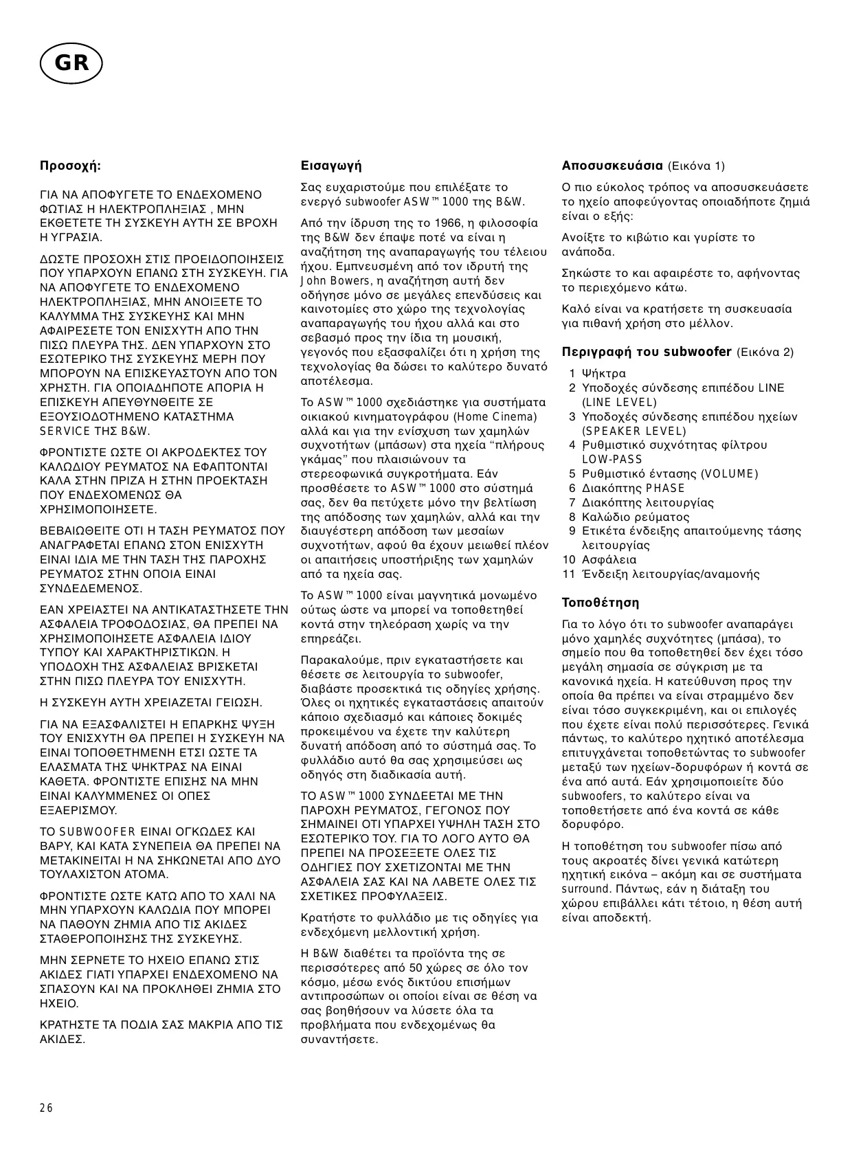Aπ1 την 3δρυση της το 1966, η φιλοσοφ3α της B&W δεν .παψε ποτ. να ε3ναι η αναζ;τηση της αναπαραγωγ;ς του τ.λειου ;χου. Εµπνευσµ.νη απ1 τον ιδρυτ; της John Bowers, η αναζ;τηση αυτ; δεν οδ;γησε µ1νο σε µεγλες επενδ+σεις και καινοτοµ3ες στο χ=ρο της τεχνολογ3ας αναπαραγωγ;ς του ;χου αλλ και στο σεβασµ1 προς την 3δια τη µουσικ;, γεγον1ς που εξασφαλ3ζει 1τι η χρ;ση της τεχνολογ3ας θα δ=σει το καλ+τερο δυνατ1 αποτ.λεσµα. Το ASW™1000 σχεδιστηκε για συστ;µατα οικιακο+ κινηµατογρφου (Home Cinema) αλλ και για την εν3σχυση των χαµηλ=ν συχνοτ;των (µπσων) στα ηχε3α “πλ;ρους γκµας” που πλαισι=νουν τα στερεοφωνικ συγκροτ;µατα. Εν προσθ.σετε το ASW™1000 στο σ+στηµ σας, δεν θα πετ+χετε µ1νο την βελτ3ωση της απ1δοσης των χαµηλ=ν, αλλ και την διαυγ.στερη απ1δοση των µεσα3ων συχνοτ;των, αφο+ θα .χουν µειωθε3 πλ.ον οι απαιτ;σεις υποστ;ριξης των χαµηλ=ν απ1 τα ηχε3α σας. Το ASW™1000 ε3ναι µαγνητικ µονωµ.νο ο+τως =στε να µπορε3 να τοποθετηθε3 κοντ στην τηλε1ραση χωρ3ς να την επηρεζει. Παρακαλο+µε, πριν εγκαταστ;σετε και θ.σετε σε λειτουργ3α το subwoofer, διαβστε προσεκτικ τις οδηγ3ες χρ;σης. Dλες οι ηχητικ.ς εγκαταστσεις απαιτο+ν κποιο σχεδιασµ1 και κποιες δοκιµ.ς προκειµ.νου να .χετε την καλ+τερη δυνατ; απ1δοση απ1 το σ+στηµ σας. Το φυλλδιο αυτ1 θα σας χρησιµε+σει ως οδηγ1ς στη διαδικασ3α αυτ;. ΤΟ ASW™1000 ΣΥΝ∆ΕΕΤΑΙ ΜΕ ΤΗΝ ΠΑΡΟΧΗ ΡΕΥΜΑΤΟΣ, ΓΕΓΟΝΟΣ ΠΟΥ ΣΗΜΑΙΝΕΙ ΟΤΙ ΥΠΑΡΧΕΙ ΥΨΗΛΗ ΤΑΣΗ ΣΤΟ ΕΣΩΤΕΡΙΚD ΤΟΥ. ΓΙΑ ΤΟ ΛΟΓΟ ΑΥΤΟ ΘΑ ΠΡΕΠΕΙ ΝΑ ΠΡΟΣΕΞΕΤΕ ΟΛΕΣ ΤΙΣ Ο∆ΗΓΙΕΣ ΠΟΥ ΣΧΕΤΙΖΟΝΤΑΙ ΜΕ ΤΗΝ ΑΣΦΑΛΕΙΑ ΣΑΣ ΚΑΙ ΝΑ ΛΑΒΕΤΕ ΟΛΕΣ ΤΙΣ ΣΧΕΤΙΚΕΣ ΠΡΟΦΥΛΑΞΕΙΣ. Κρατ;στε το φυλλδιο µε τις οδηγ3ες για ενδεχ1µενη µελλοντικ; χρ;ση. Η B&W διαθ.τει τα προϊ1ντα της σε περισσ1τερες απ1 50 χ=ρες σε 1λο τον κ1σµο, µ.σω εν1ς δικτ+ου επισ;µων αντιπροσ=πων οι οπο3οι ε3ναι σε θ.ση να σας βοηθ;σουν να λ+σετε 1λα τα προβλ;µατα που ενδεχοµ.νως θα συναντ;σετε.