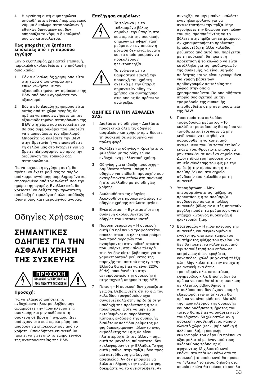Προσοχή: Για να ελαχιστοποιήσετε το ενδεχµενο ηλεκτροπληξίας µην αφαιρέσετε την πίσω πλευρά της συσκευής και µην εκθέσετε τη συσκευή σε βροχή ή υγρασία. ∆εν υπάρχουν στο εσωτερικ µέρη που µπορούν να επισκευαστούν απ το χρήστη. Οποιαδήποτε επισκευή θα πρέπει να γίνει απ το τµήµα service της αντιπροσωπείας της B&W.